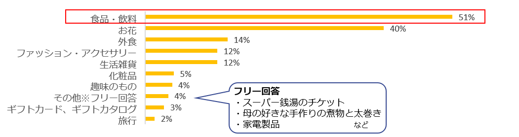 母の日と言えばカーネーションのイメージがありますが、お花を抑えて、プレゼントとして最も多かったのは「食品・飲料」という結果になりました。