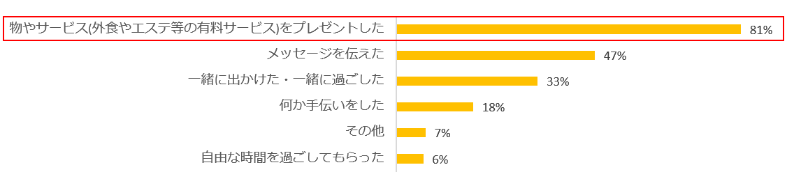 お祝いの仕方としても多かったのは「物やサービスをプレゼントした」でした。