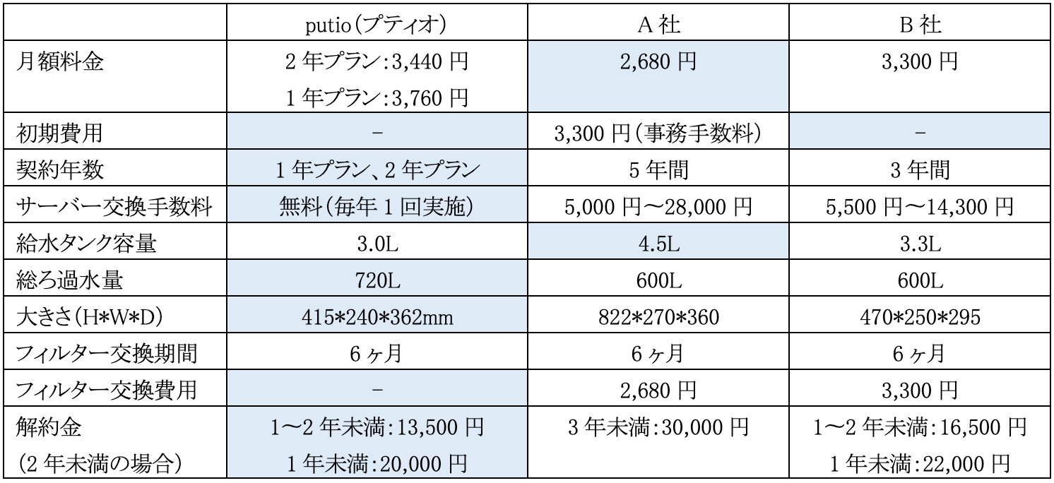 ■浄水型ウォーターサーバー大手 比較表