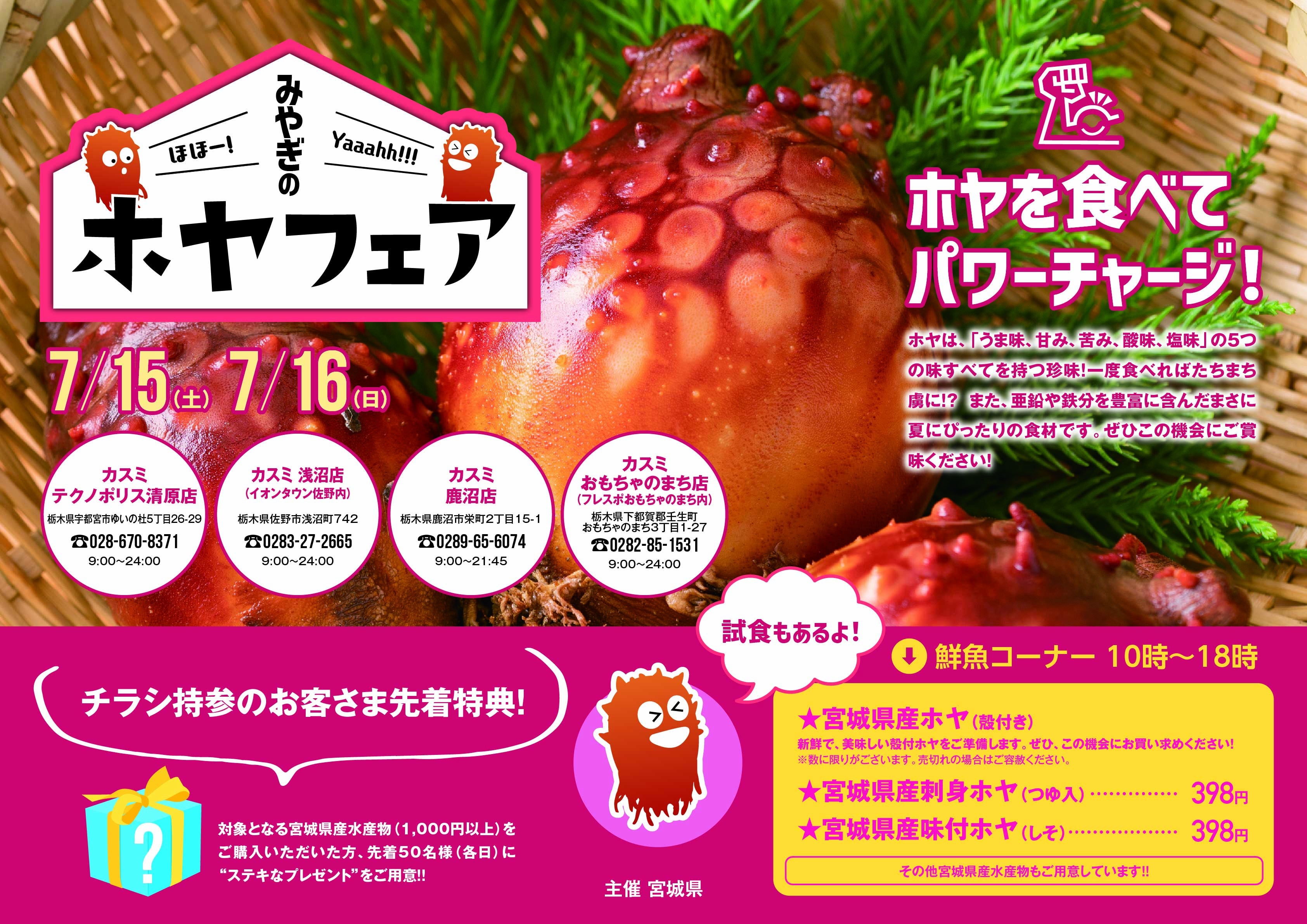 宮城県は、宮城県産ホヤの新たな販路開拓と需要拡大を図るため、茨城県及び栃木県において初の取組となるホヤを中心とした県産水産物販売フェアを実施中です。関東地方を中心に量販店を展開しているスーパーマーケット「カスミ」様が栃木、茨城に展開している12店舗の鮮魚コーナーにて、ホヤを中心とした県産水産物のPR販売を6月末から順に実施しています。おかげさまで皆様にご好評をいただき、残りは7月15日、7月16日の2日間を残すのみです。これほど新鮮なホヤが店頭に並ぶ機会は滅多に無いので、近隣にお住まいの方は是非この機会に宮城県産ホヤをご賞味ください。
