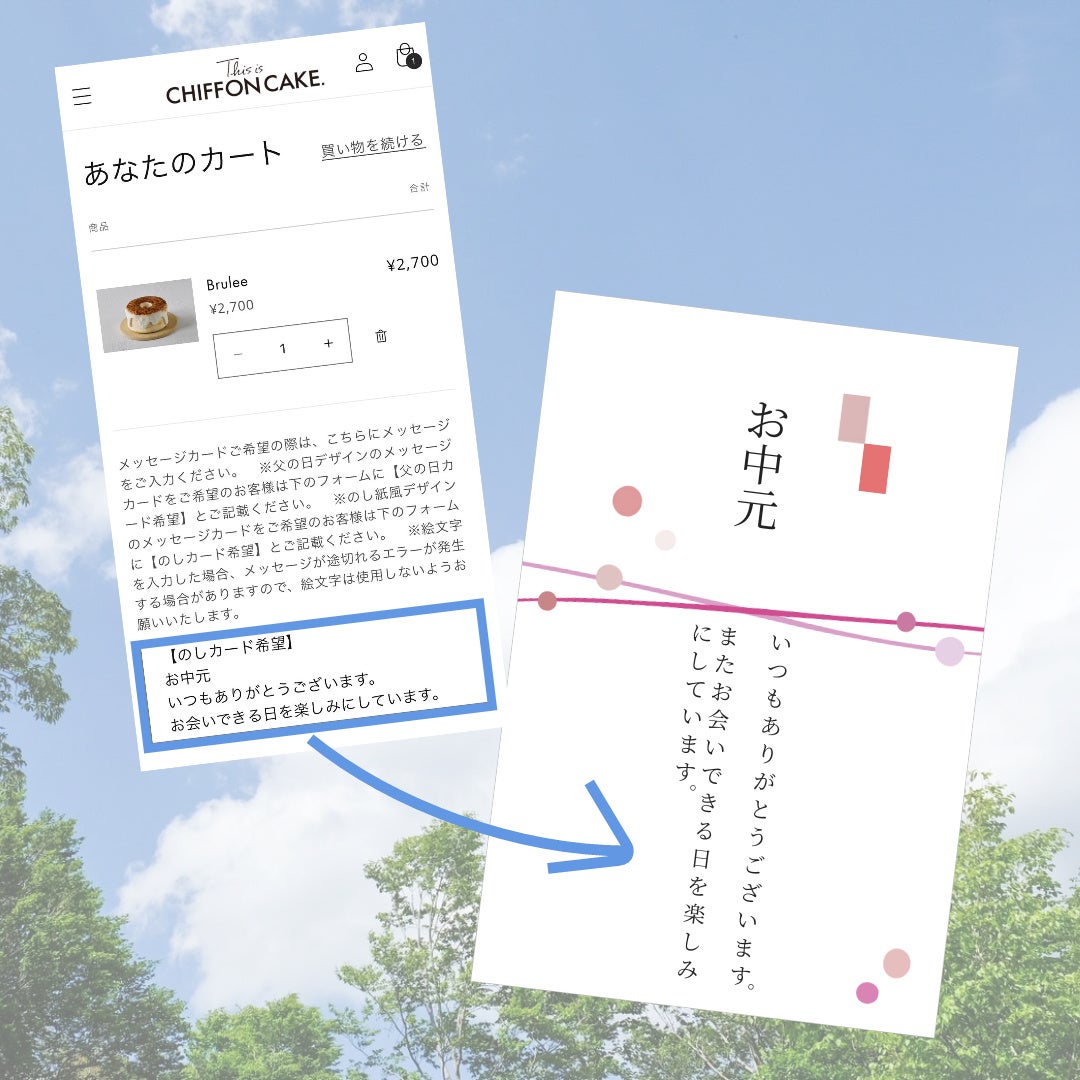 This is CHIFFON CAKE.では、通常カードに加えて、お中元や夏ギフト向け「のしデザインのメッセージカード」をご用意しております。
