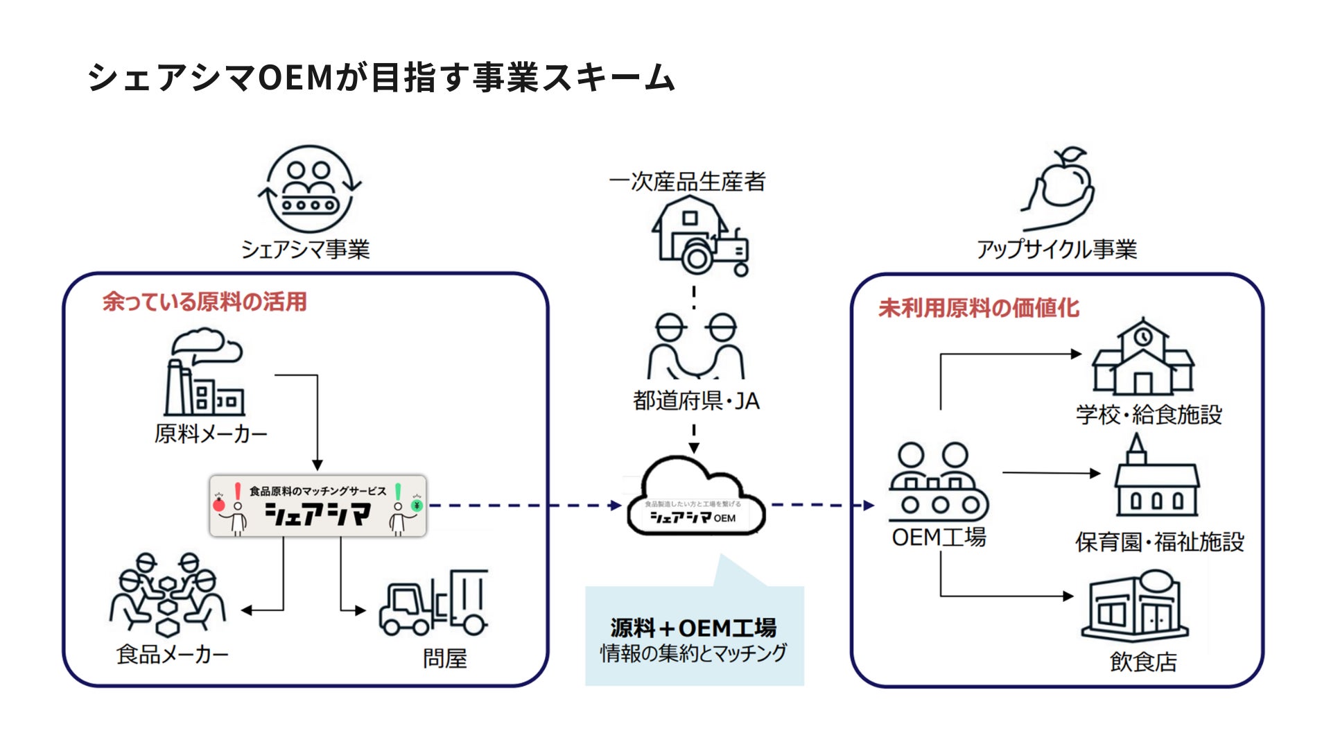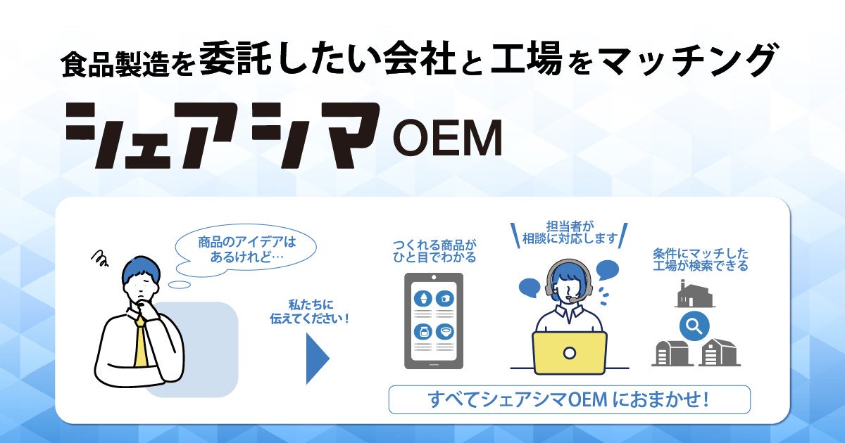 「シェアシマOEM」では、食品OEMに特化した工場検索サービスを提供します。OEM工場を探している企業(委託側)と、OEMを受託したい工場(受託側)のマッチングを促します。企業のニーズに合わせた適切な工場とのマッチングを支援し、スムーズな業務遂行を支援します。2023年1月30日に試験運用を開始して以降、11企業18案件(2023年7月現在)が進行しております。