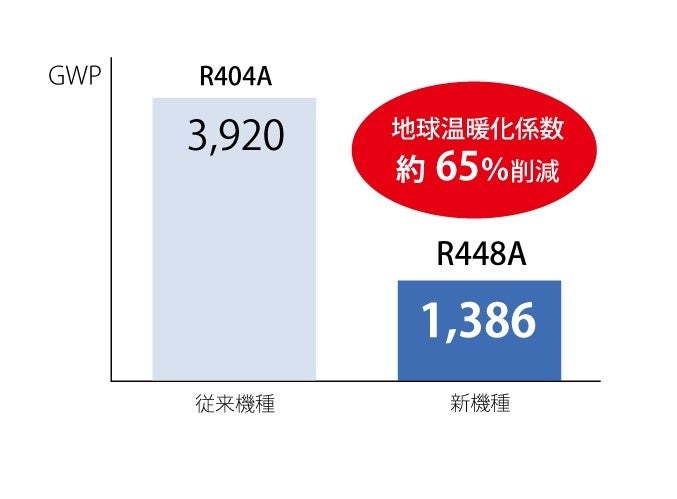 冷媒をR404A(GWP:3920)から、地球温暖化係数の低いR448A(GWP:1386)に変更。地球温暖化係数約65%削減。照明は冷凍機別置型オープンショーケースCLAIRシリーズ用のクレアLED採用で省エネ。