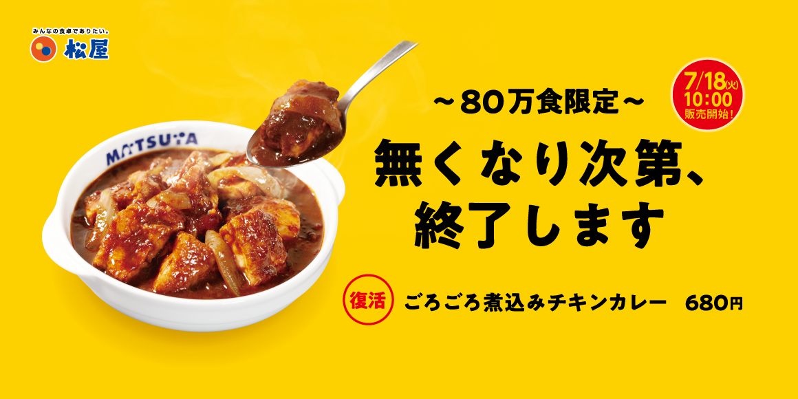 人気の根強いオリジナルカレーソースを使った松屋カレーの代表格「ごろチキ」が復活