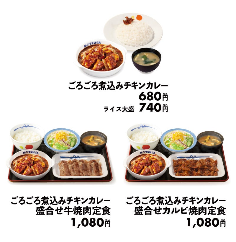 商品名 ごろごろ煮込みチキンカレー 680円 ごろごろ煮込みチキンカレー盛合せ牛焼肉定食 1,080円 ごろごろ煮込みチキンカレー盛合せカルビ焼肉定食 1,080円 ※お持ち帰りいただけます。お持ち帰りにみそ汁は付きません。 お持ち帰りの場合、みそ汁は別途60円でお求めいただけます。 ※税込み価格です。 ※「盛合せ定食」に福神漬けはつきません。ご希望のお客様は従業員にお申し付けください。 ※株主優待券は上記全てのメニューにご使用いただけます。 発売日 2023年7月18日(火)午前10時 ~ 対象店舗 一部店舗を除く全国の松屋 |