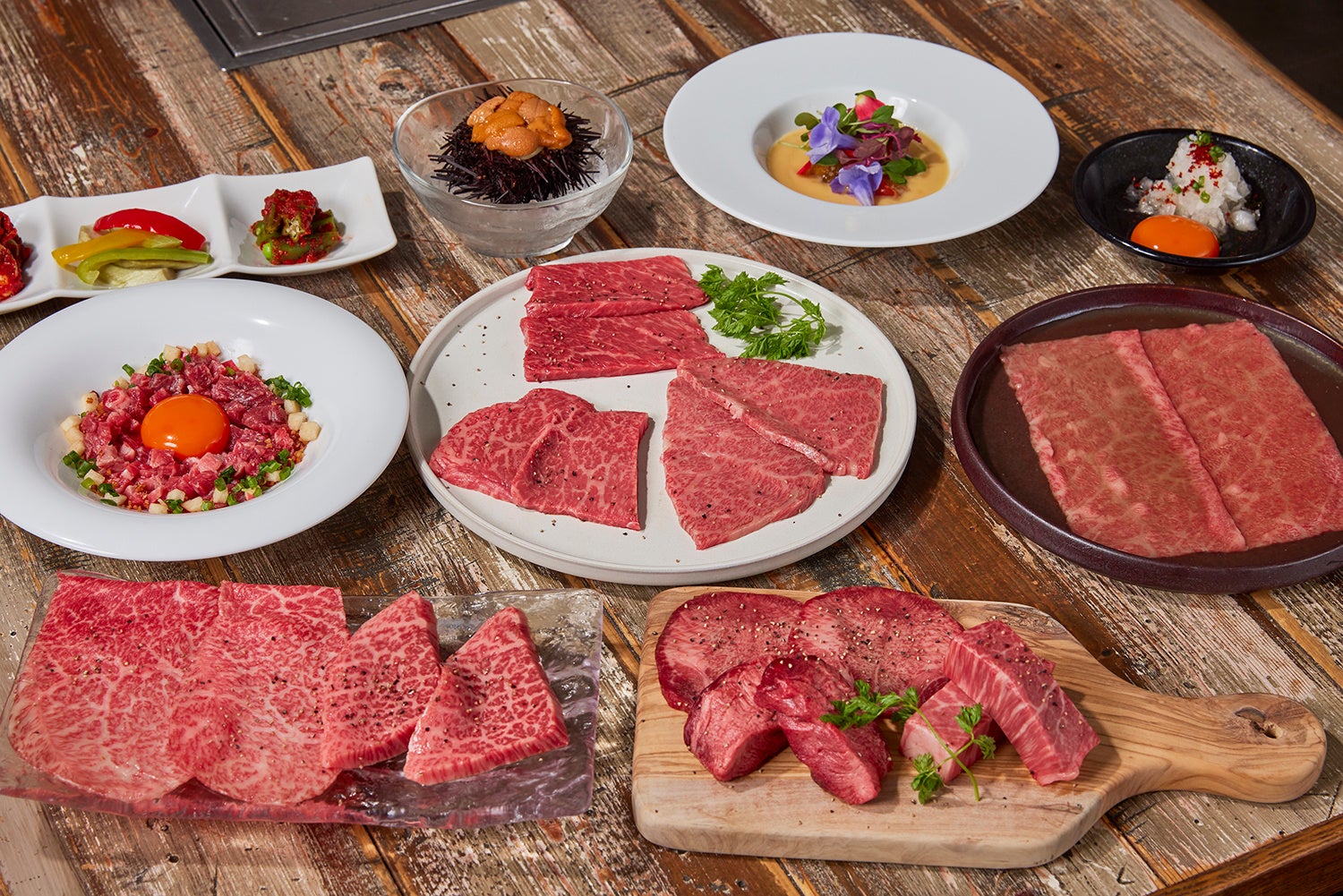 KINTAN自慢の生肉は、とろけるような口どけの松阪牛サーロインを角切りのユッケにし、創業当時に提供していた復刻スタイルでご提供いたします。焼肉ではKINTANのシグニチャーメニュー“30日間熟成KINTANの食べ比べや極上の“フィレ肉”、”松阪牛のザブトンやトモサンカクなど希少部位6種215gを贅沢にお楽しみいただけます。〆には、しこしことした食感が特徴の平打ち麺タリアテッレに北海道産の生雲丹をこれでもか!と乗せたお食事をご用意いたしました。節目の年にふさわしい、焼肉レストランKINTANの特別なコースを是非、体験ください。