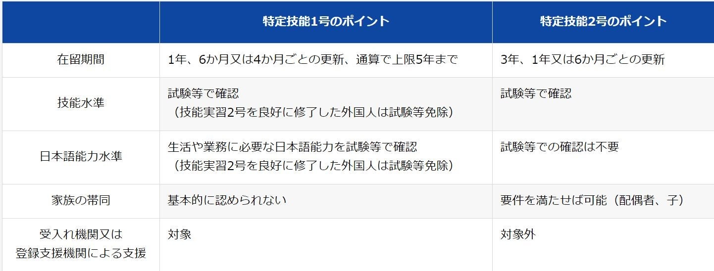 1号の在留期間は5年を上限とし、技能水準・日本語能力水準を試験等で確認します。対象者が勤務する受け入れ機関又は登録支援機関による支援の対象であることが条件です。