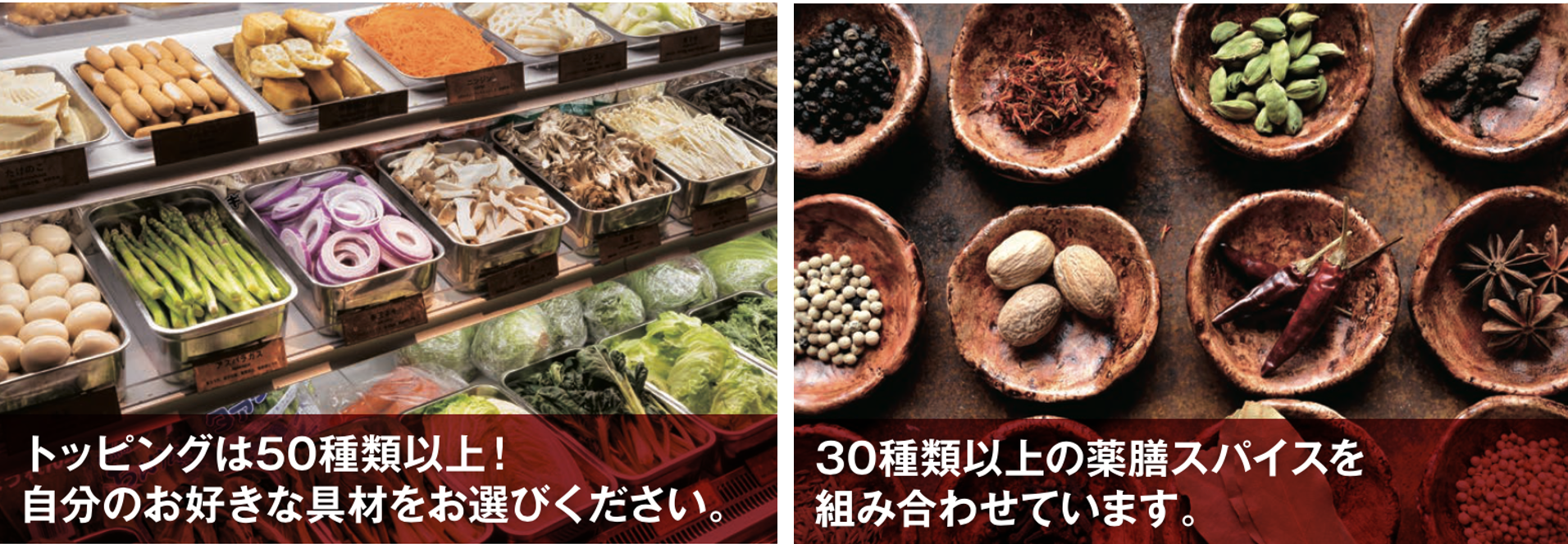 美味しく食事しながら身体を内側から元気にする、美容健康・医食同源」をコンセプトにトッピングや辛さが選べるスパイシーなスープ春雨や薬膳火鍋を提供。スープは30種類以上の薬膳素材を加え、辛さと旨みと華やかな香りが渾然一体となっており、店舗ごとに炊き出し、レシピも異なるというこだわりの逸品を提供。