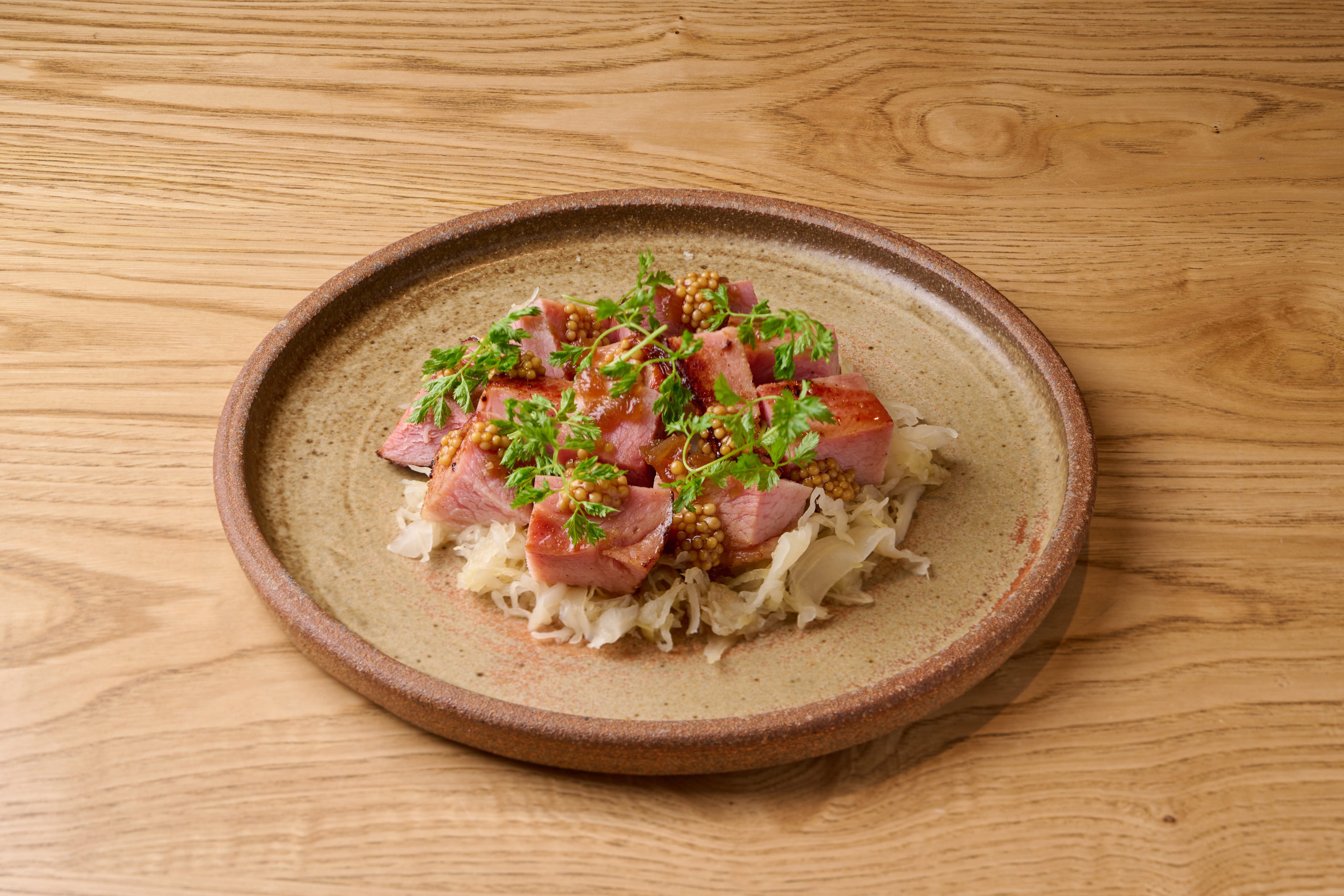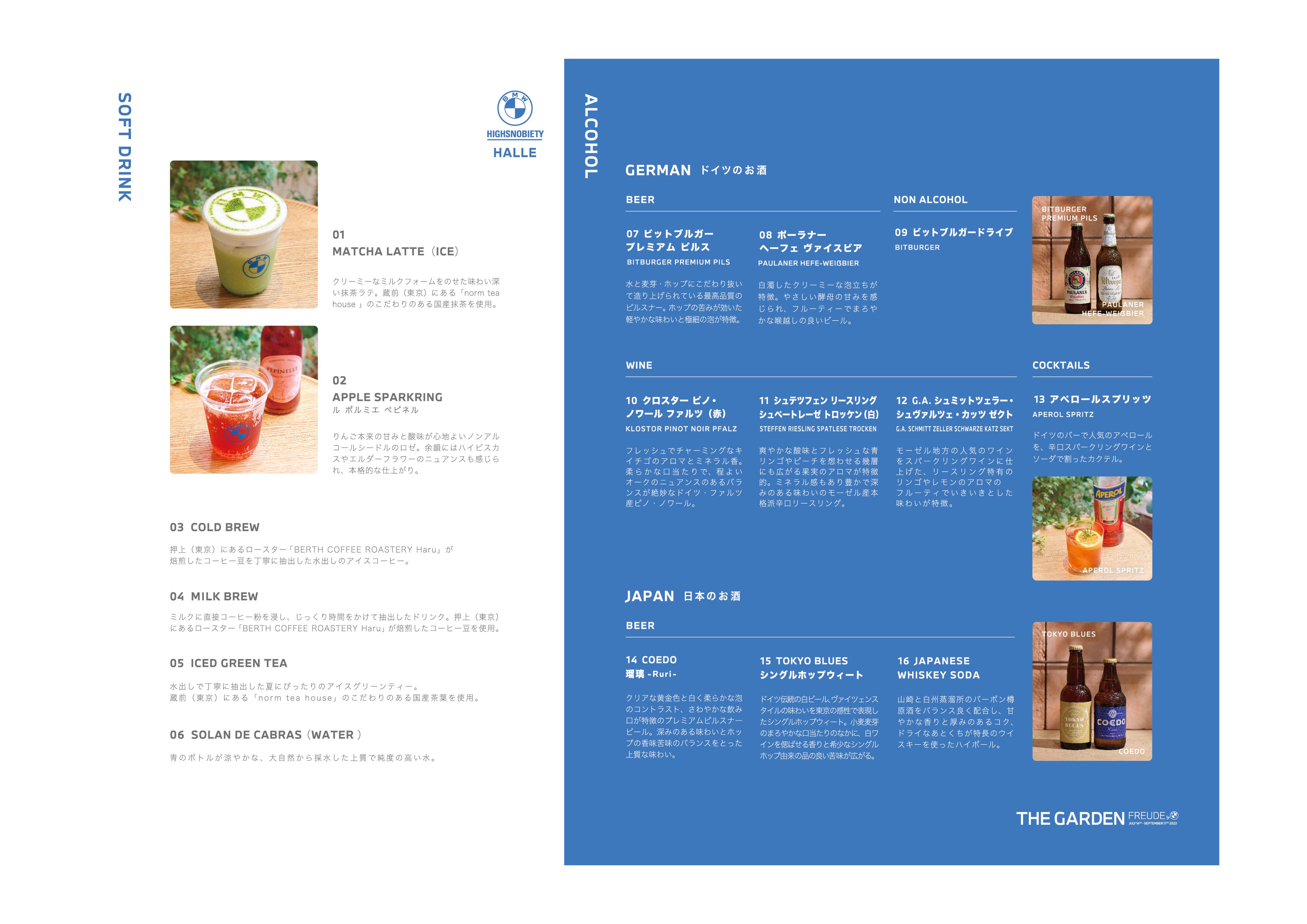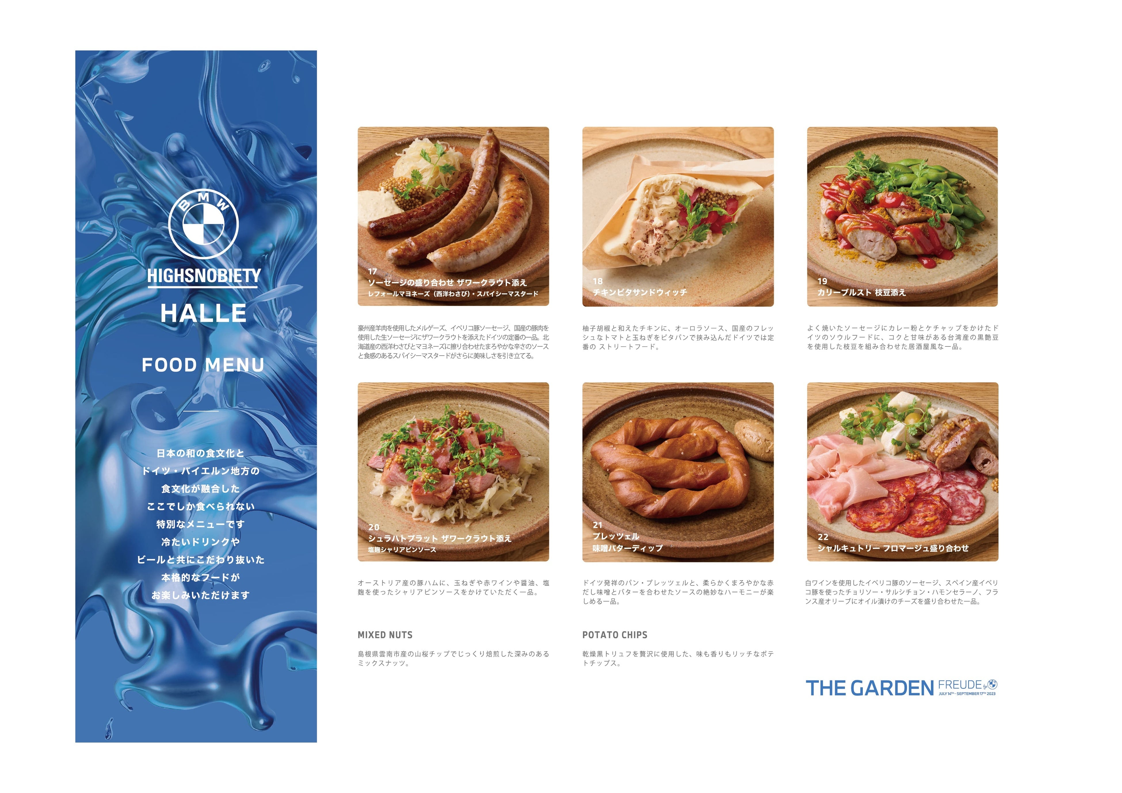 また、フードは西洋わさびをディップして召し上がるソーセージの盛り合わせや味噌バタープレッツェル、塩麹を使ったシュラハトプラットなど、伝統的なドイツ料理に日本のエッセンスを取り入れたメニューを提供する。ビールの本場でもあるドイツと日本の食文化が融合した本格的な創作料理である。