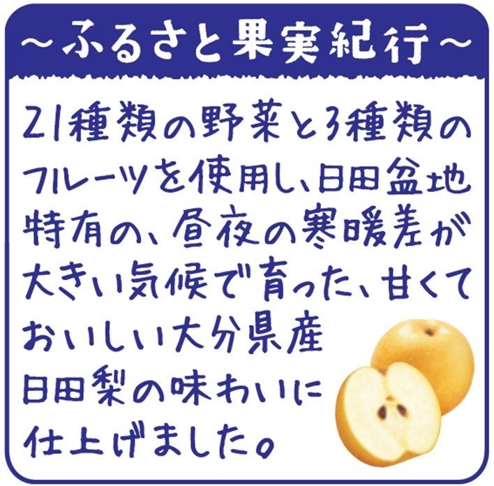 「野菜生活100 大分日田梨ミックス」は、甘くておいしい大分県産日田梨の味わいに仕上げた野菜&果実100%ミックスジュースです。朝食のおともやリフレッシュしたいときにおすすめです。パッケージの背景には、大分県日田市にある室原橋から手水野川の渓流渓谷を望む風景をデザインしています。
