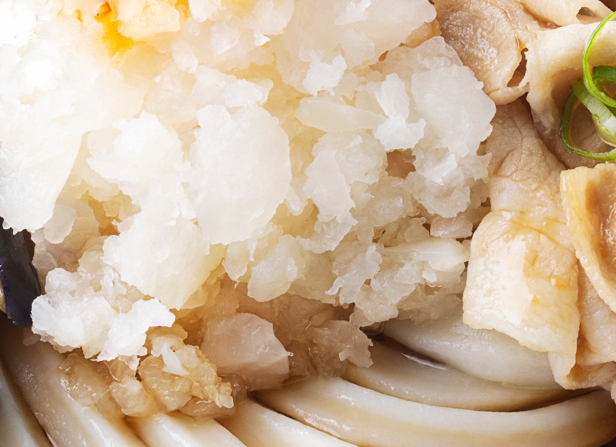 大根を粗くおろした鬼おろしをひと噛みすれば、シャキシャキとした食感、大根本来の風味やみずみずしさが口いっぱいに広がります。鬼おろしは、みずみずしさだけではなく、大根本来の味わいが感じられるものを使用。鬼おろしの削り方や粒の大きさまで試行錯誤し、のどごしの良い麺との絡みを良くしています。