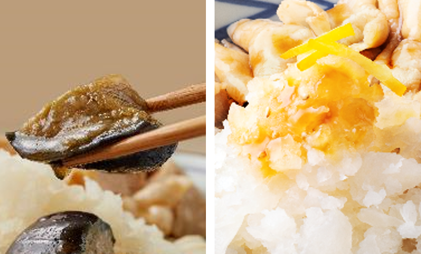 『鬼おろし豚しゃぶぶっかけうどん』をより一層おいしくするために欠かせないなすの揚げ浸しは、醤油の効いた濃いめのだしに付け込み、だしの旨みをたっぷりと染みこませています。ひと噛みすれば、じゅわりと旨みが広がります。彩りの良い刻み柚子は、爽やかな香りが鼻から抜け、さっぱりとした清涼感をもたらします。