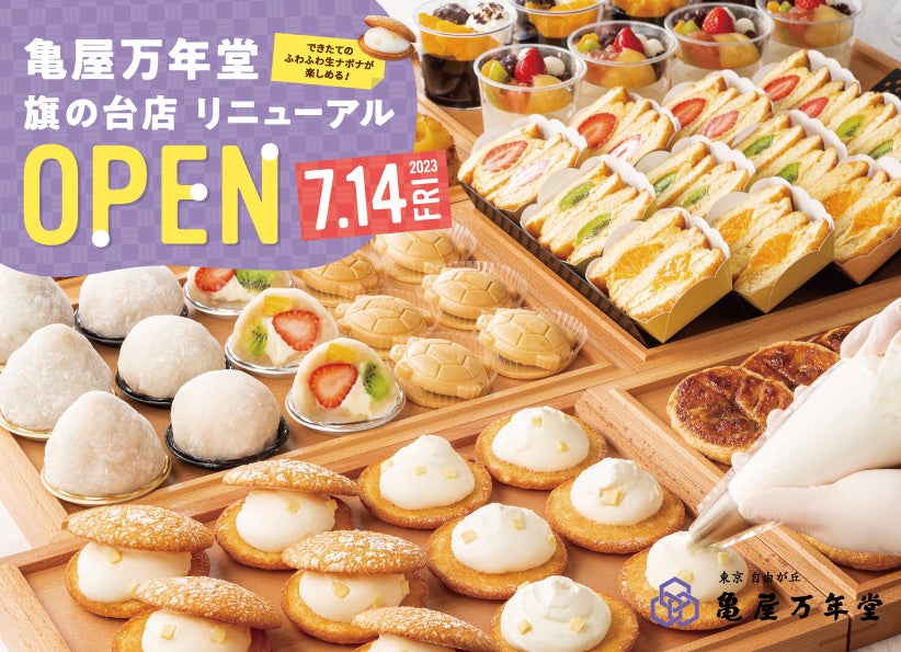 株式会社亀屋万年堂(本社・工場:神奈川県横浜市都筑区 )は、「できたて・焼きたてのおいしさをお届けする進化した和菓子屋」をコンセプトに、厨房を併設し店内調理で和菓子や焼菓子を作る新しい業態にした店舗を、東京都品川区にある亀屋万年堂 旗の台店 (品川区旗の台2-8-9) にて2023年7月14日(金)にオープンいたします。