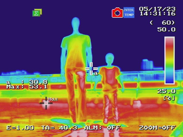 サーモグラフィーによる表面温度計測では、大人は首から腰のあたりまで青~黄色のグラデーションで、下半身から赤く表示されるのに対し、子どもの高さでは首から下はすべて赤く表示されました。