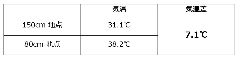 大人の胸の高さ(150cm)では気温31.1℃に対し、子どもの胸の高さ(80cm)では気温38.2℃となり、その気温差は7℃程度となりました。