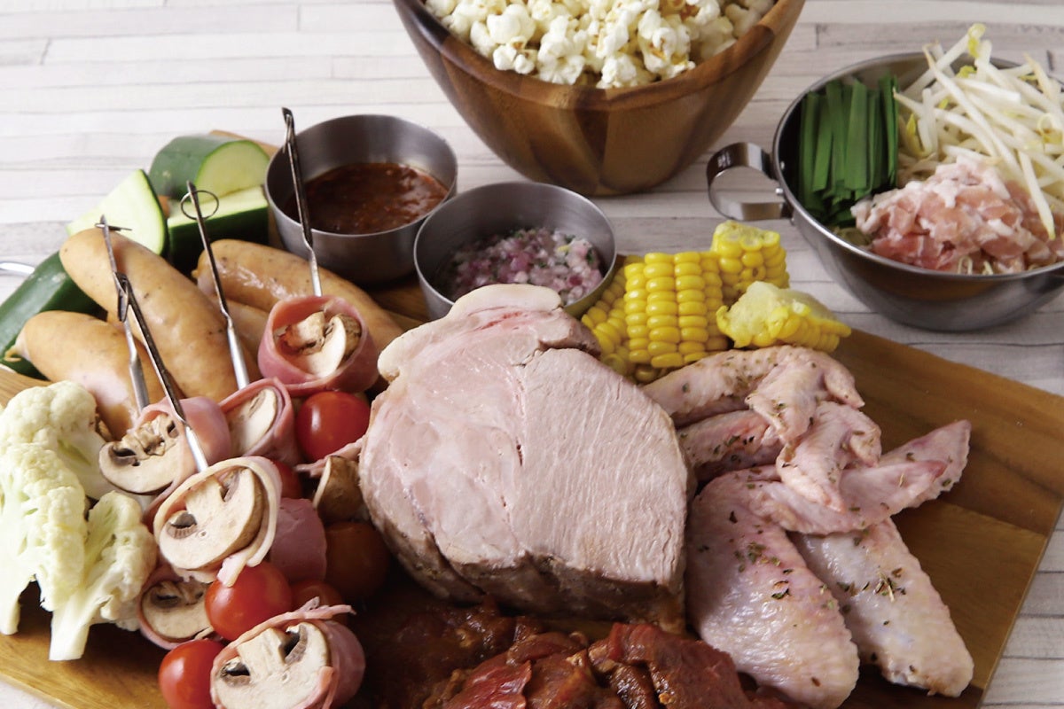 Chaque Jour EpanouiのBBQプレートは、ビーフ・ポークをメインにチキンや野菜も楽しめる、みんなでワイワイ焼いて楽しむスタイル。〆は香港風焼きそばで。おかわり自由なおつまみポップコーンも。