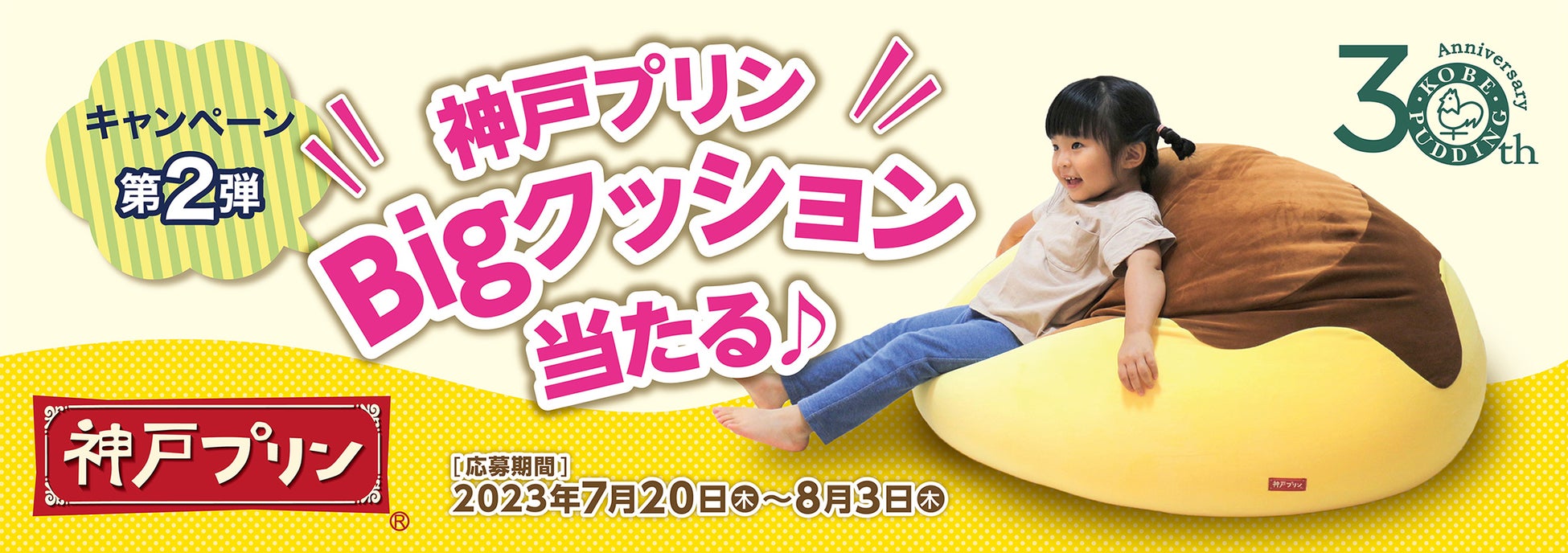 トーラクでは神戸プリン発売30周年を記念して、Twitterキャンペーン第2弾「癒しの神戸プリンBigクッションが当たるキャンペーン」を7月20日(木)12:00よりスタートいたします。