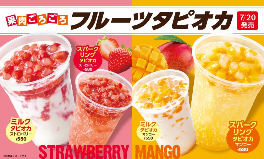 ミルクのコクと、ごろごろにカットされたマンゴーの果肉の甘さをしっかりと楽しむことができる、フルーツドリンクです。もちもちとした食感のタピオカがたまらない、夏季限定商品です。