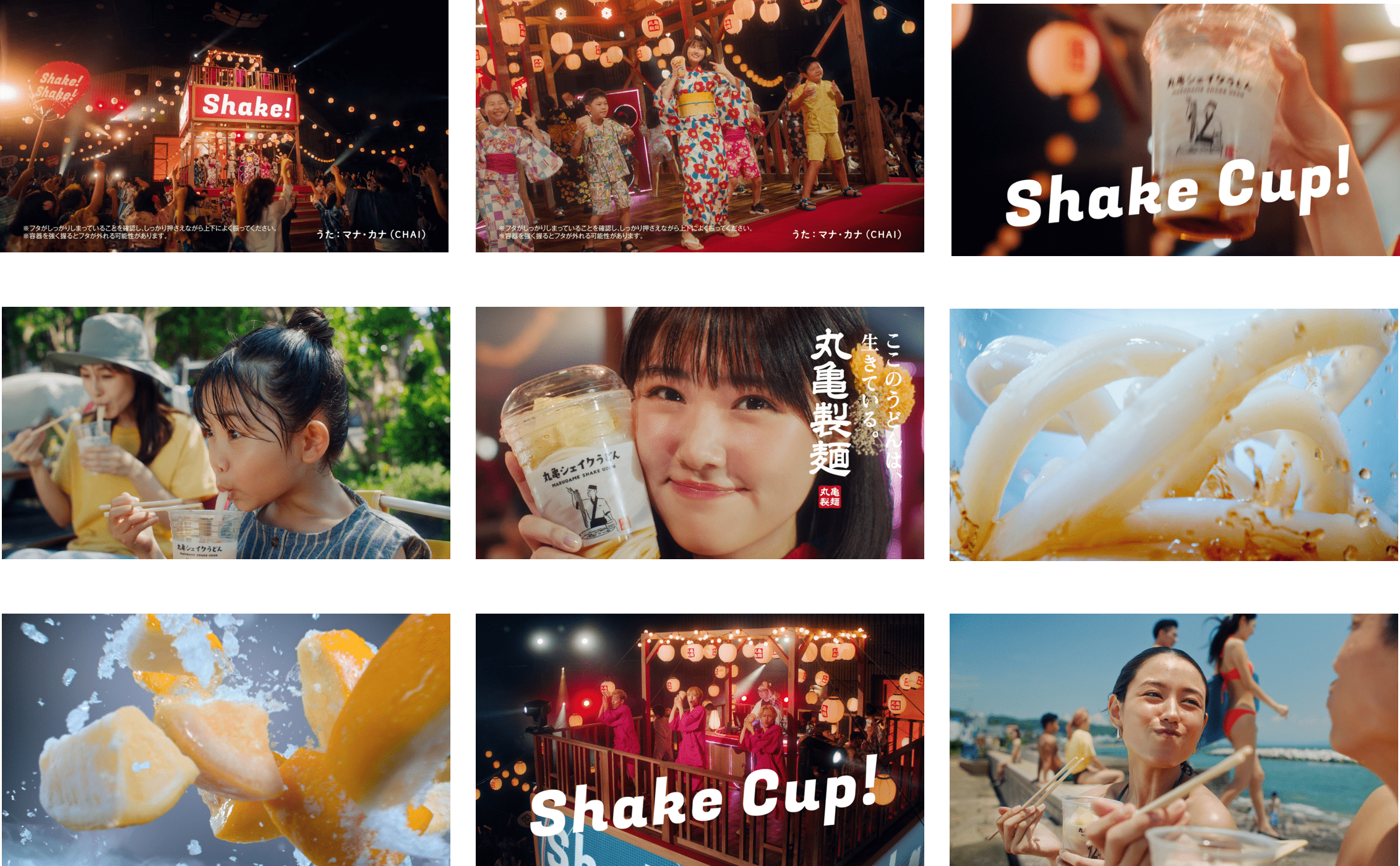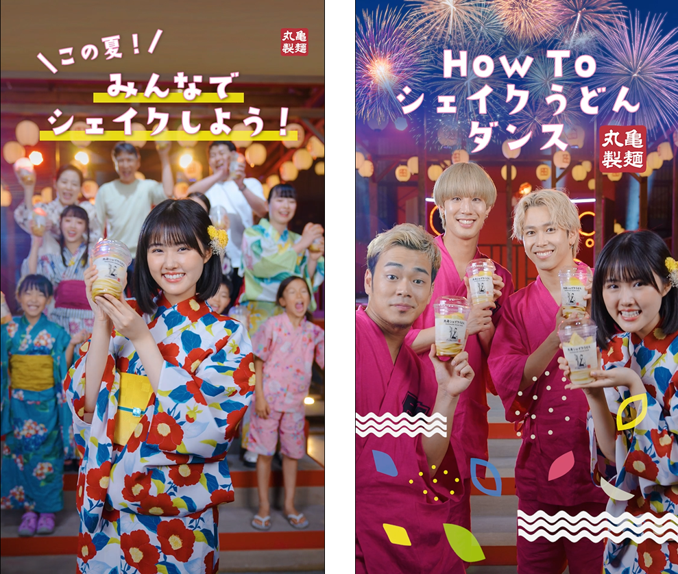 夏の「丸亀シェイクうどん」TVCMには、前回に引き続き原菜乃華さん、パワーパフボーイズ、そして新たに石井竜也さんが出演しています。夏祭りをイメージした華やかなやぐらのまわりを浴衣姿の原さんや子どもたちが「シェイクうどんダンス」を楽しく踊る、夏らしくにぎやかなCMとなっています。