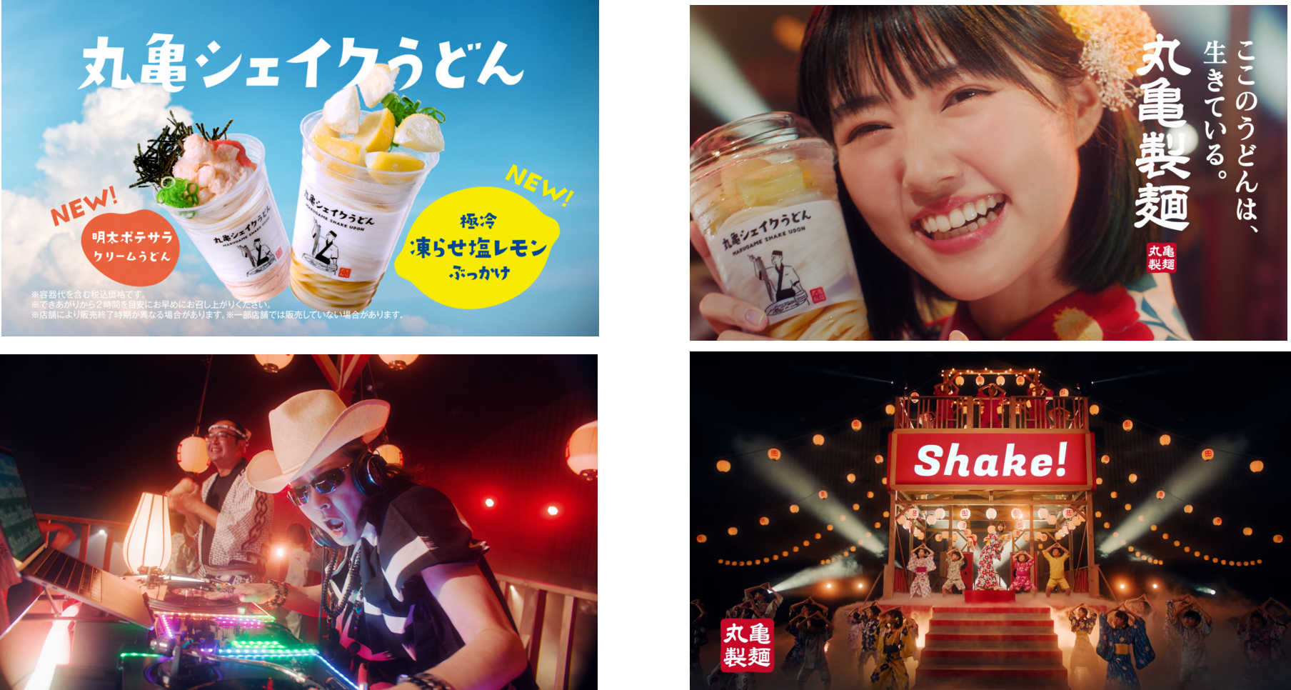 お祭りだけでなく、公園やビーチ、運動中のシーンなど様々な場所で家族や仲間、大切な人と一緒に「丸亀シェイクうどん」を幸せそうに頬張る人々の姿が映し出されます。つるつるとしたのどごしの良い打ち立てうどんに、凍らせた塩レモンをどさっとのせた『極冷 凍らせ塩レモンぶっかけうどん』と、ピリリとまろやかな味わいがクセになる『明太ポテサラクリームうどん』が登場します。