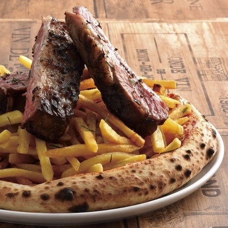 ポークスペアリブとフライドポテトを山盛りトッピングした豪快なピッツア。