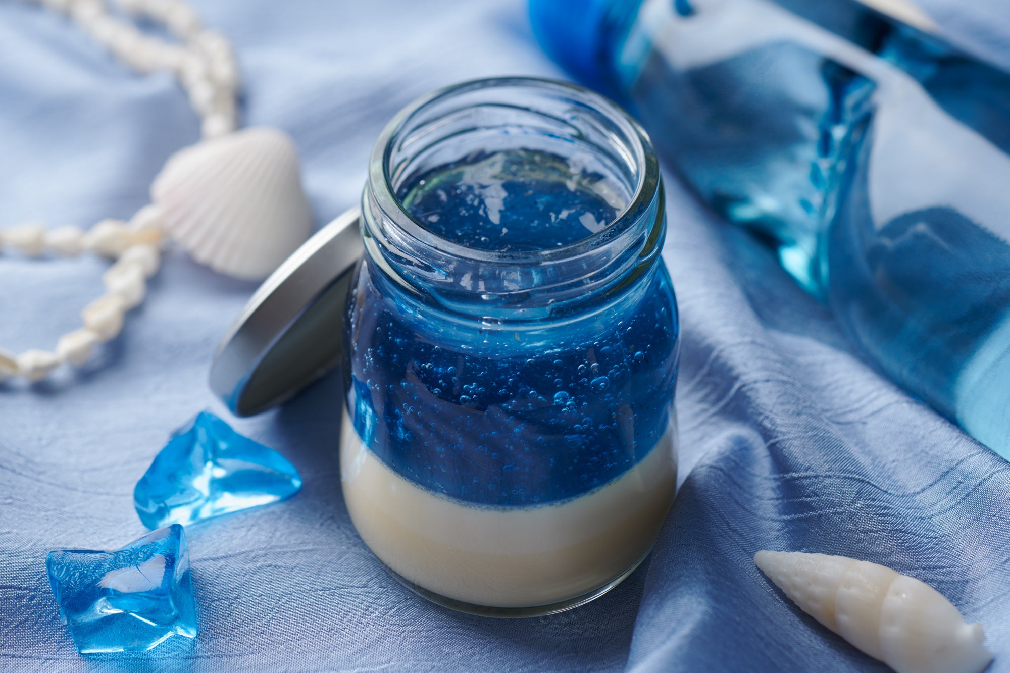 なめらかなプリンの上に深海を表現したブルーのジュレはラムネ味と