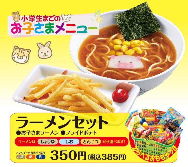 『丸源ラーメン』では、選べるおもちゃ付きの「お子さまmenu」のご用意がございます。