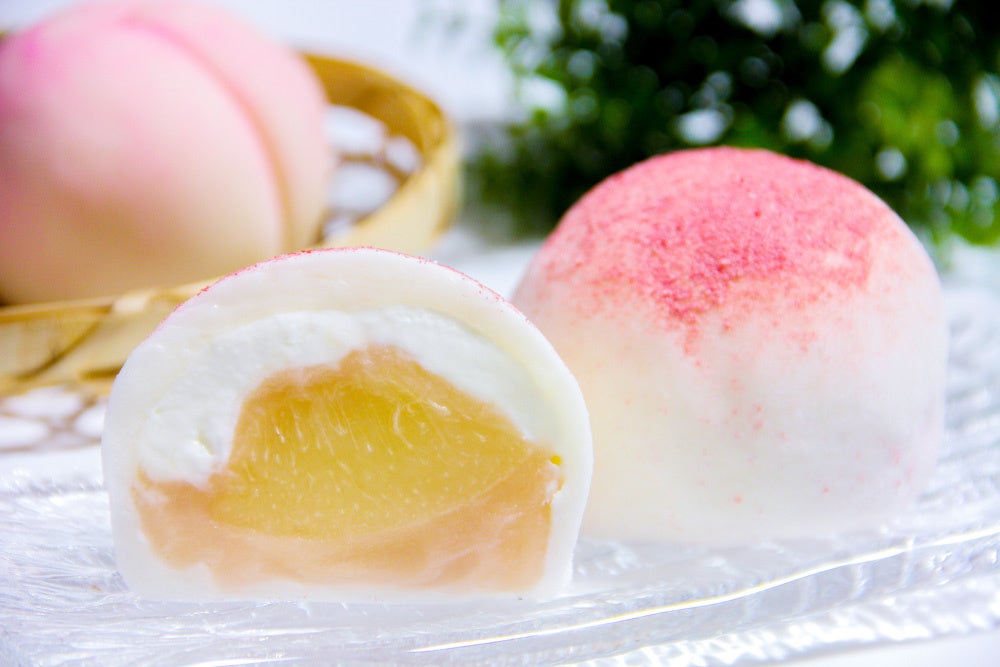 プレミアム大福シリーズの中でも人気No.1の商品、夏季限定「白桃大福Premium」。 山形県産の果汁たっぷり白桃、芳醇な生クリーム、自家製桃あんをマシュマロのようにふわふわな大福餅で包み、仕上げにいちごパウダーをまぶしました。 ピンクの見た目もかわいく華やかな「白桃大福」は、贈り物にも大変喜ばれるお菓子です。 |