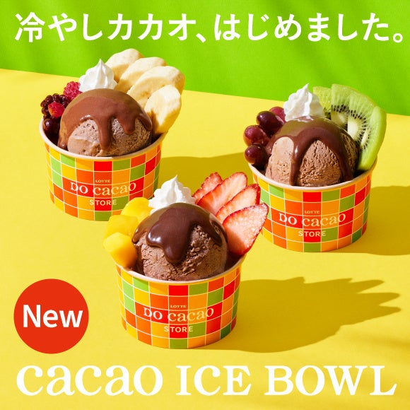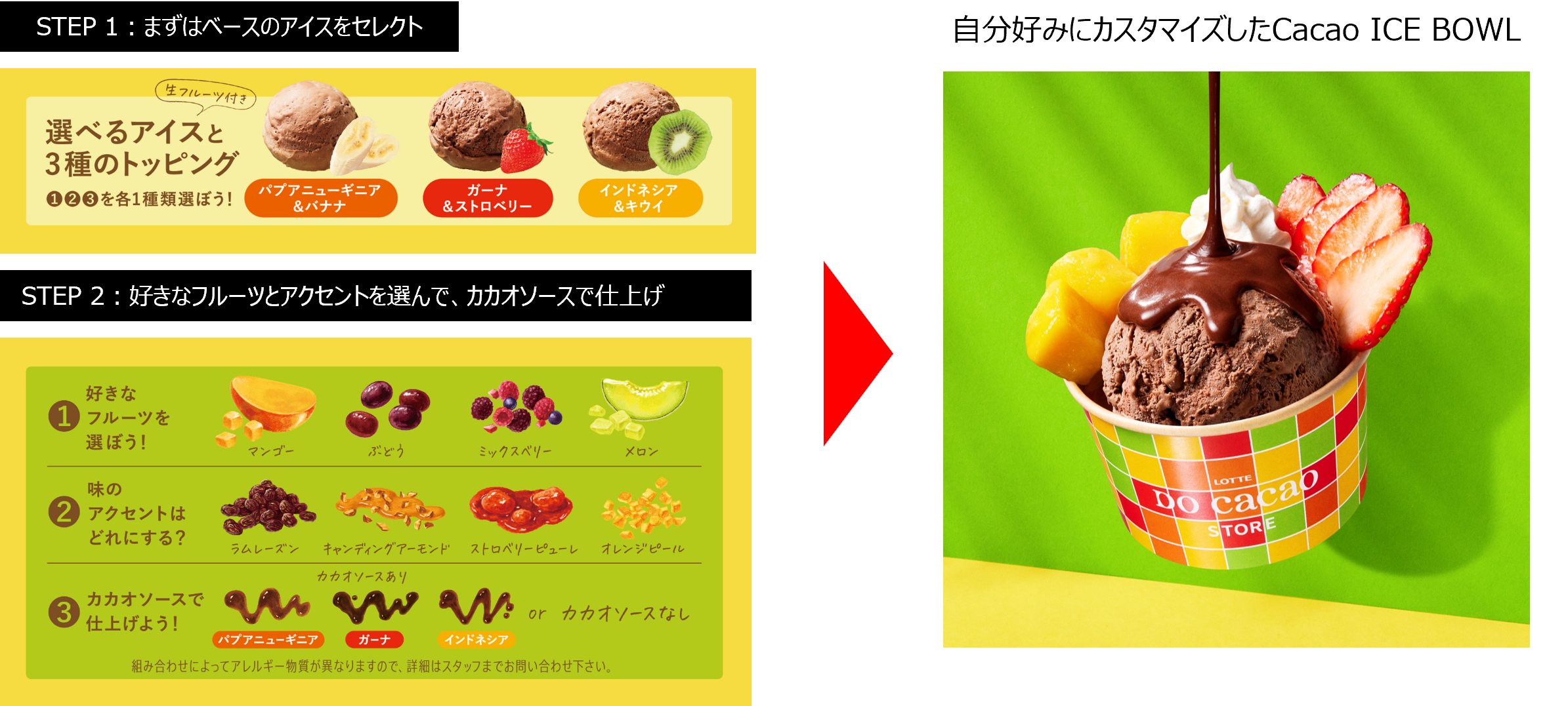 お店イチオシのメニューは「Cacao ICE BOWL」。「ガーナ」「パプアニューギニア」「インドネシア」の特長を生かした「Cacao ICE」に、自分好みのカスタマイズを楽しめるメニュー。ベースとなる「Cacao ICE」は、ナッツのようなコク深い「ガーナ」には甘酸っぱい苺、フルーティーな香りと酸味のある「パプアニューギニア」にはまろやかな甘味のバナナ、真っ赤なベリーや森林の香りを持つ「インドネシア」にはさっぱりとした酸味と甘味のキウイをそれぞれ組み合わせています。そこにお好みのフルーツと、ラムレーズン、オレンジピールなどのアクセントを組み合わせ、さらに3つの産地からカカオソースを選んでオリジナルの「Cacao ICE BOWL」をお楽しみいただけます。「LOTTE DO Cacao STORE」では今後もカカオの新しい可能性を発信するため様々なメニューを提供予定です。