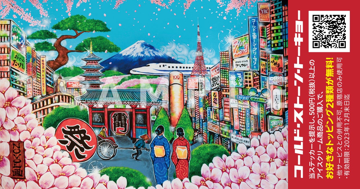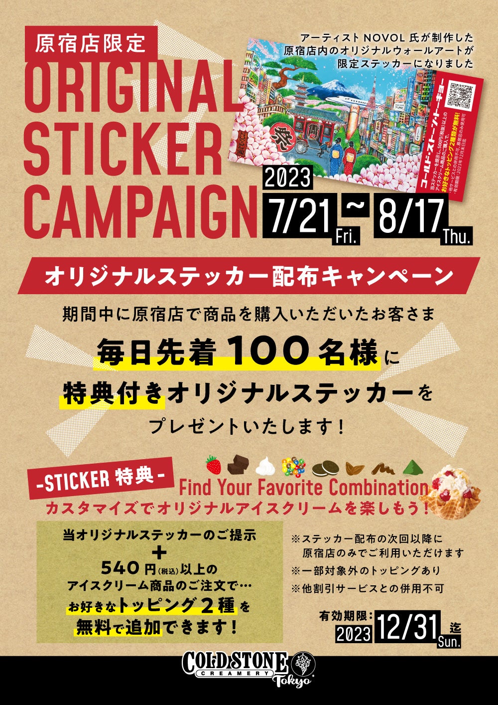 また、原宿店ではコールドストーン初の試みとして、人気アーティストNOVOL(ノボル)氏が “コールドストーン × トーキョー(東京)” をイメージした 「オリジナルウォールアート」 を店内壁面に制作。 今回は、その唯一無二のウォールアートを特典付の “オリジナルステッカー” として制作し、期間中、原宿店にて商品をご購入いただいたお客様(毎日先着100名様)に配布いたします! こちらの “オリジナルステッカー” は、次回来店時にご提示いただき、税込540円(税抜500円)以上のアイスクリーム商品をご購入いただきますと、お好きなトッピング2種類を無料で追加できる特典付ステッカーとなっております!