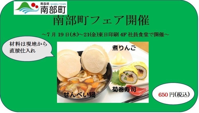 エスティは、この調印式が20日にTONICHI本社で開かれるのに合わせて、郷土料理フェアを企画。南部町がメニューの選定や材料確保に全面協力してくださり、税込650円という破格値で“地元の味”を再現できました。外部のお客様も遠慮なくお越しください※。食を通じて少しでも南部町の魅力を感じていただければ幸いです。