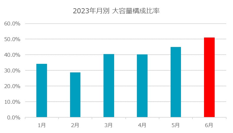 23年6月の自販機1台当たりの大容量と小容量の販売本数を見ると、早くも大容量の売上構成比が全体の販売数の半数以上を占めています。今年は昨年に比べ大容量商品の品揃えを強化しており、好調に推移しております。背景には、近年気温の上昇や、 旅行や出張等の移動が活発化しつつあるのではないかと考えます。