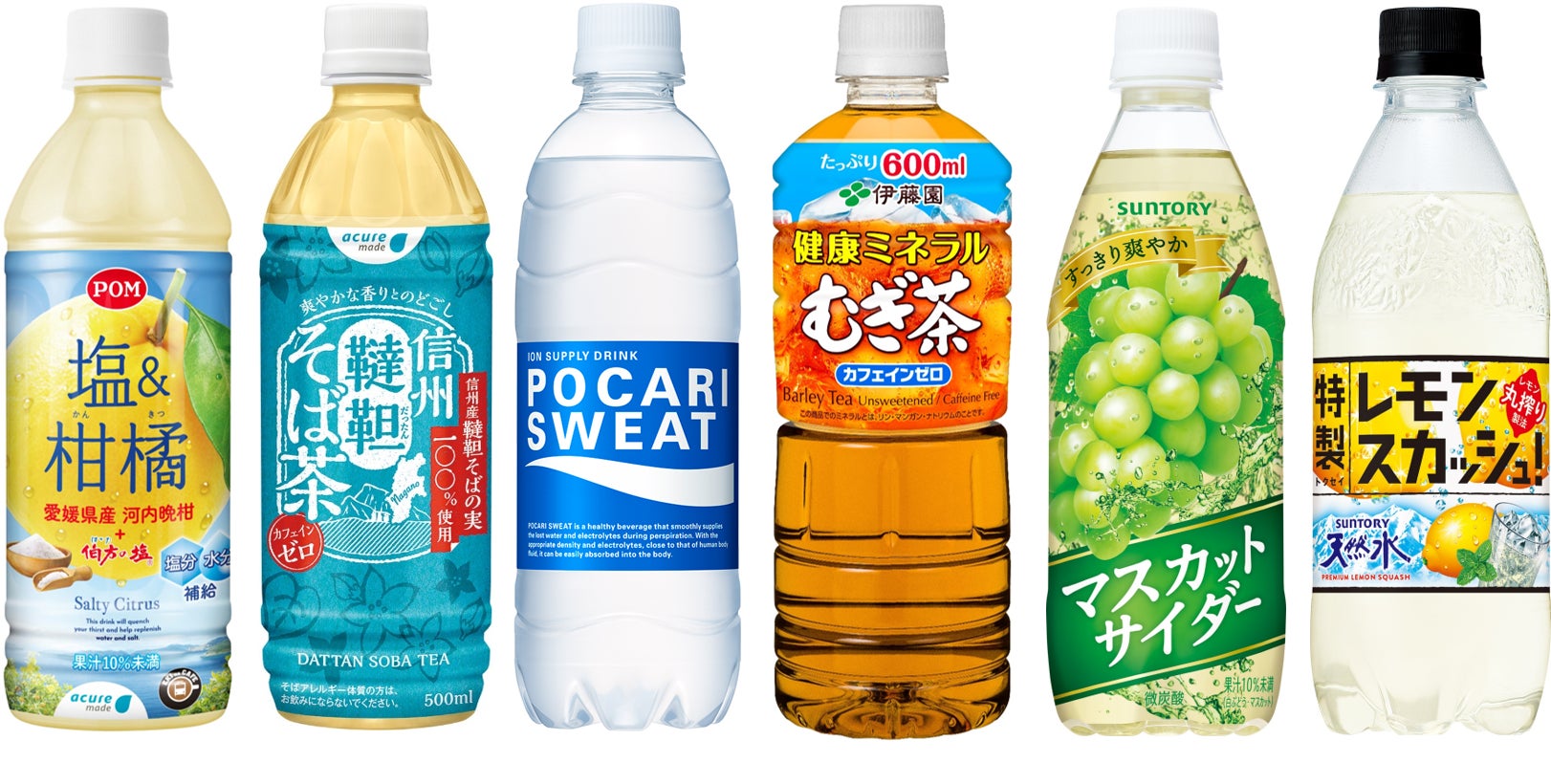 大容量サイズの商品ラインナップは盛夏期の需要に合わせ、様々なカテゴリー・特徴のある商品が並んでいます。熱中症対策として、水分のみならず塩分も補給できる「塩&柑橘(アキュアメイド)」や「ポカリスエット(大塚製薬)」をはじめとし、夏の汗をかいた体に水分だけでなくミネラル補給ができる「健康ミネラル麦茶(伊藤園)」などが代表的。特に通勤通学やレジャーのお供におすすめ商品です。また暑いエキナカで気分をさっぱりさせたいというニーズに注目した炭酸飲料も品ぞろえ豊富です。特に「マスカットサイダー(サントリー)」や「特製レモンスカッシュ(サントリー)」は若年層にも人気の高い商品です。普段とは少し違った気分を気軽にお楽しみいただける「信州韃靼そば茶(アキュアメイド)」は信州産韃靼そばの実を100%使用したノンカフェインのそば茶です。手に取っていただくとパッケージ・味わいから信州を感じることができます。その時々の気分に合わせて選んでいただけるよう豊富なラインナップでお待ちしております。