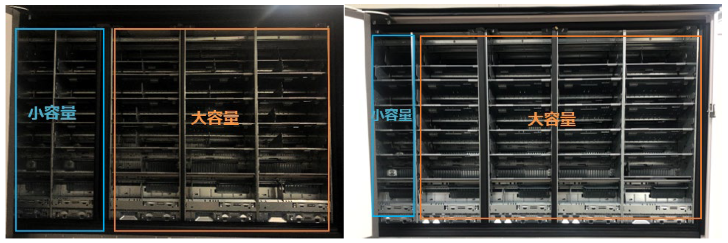 例えば、外から見ると同じように見える自販機でも、中の構造が違う場合があります。例えば、縦7段横5列の棚の構造の場合、以下の画像左は大容量サイズが横5列中3列のみ装填が可能(棚数21)、右だと横5列中4列(棚数28)に装填が可能となり、大容量サイズの商品を販売できる本数に差が生まれます。