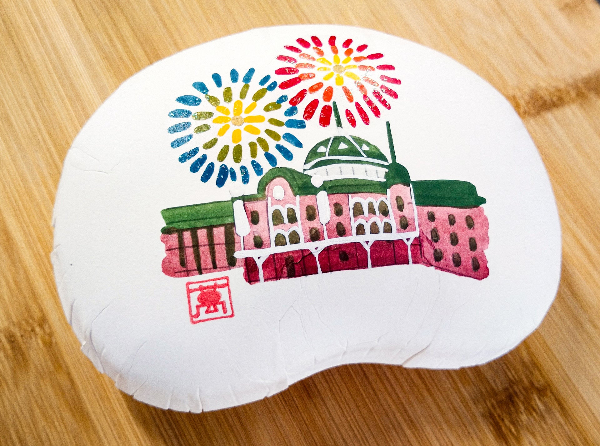 豆の形をした紙箱に九谷焼の職人が一点ずつ絵付けを施した「豆箱」。中には国産有機大豆を使用した煎り豆などの豆菓子が入っています。東京駅のシンボル丸の内駅舎と夏の風物詩である打ち上げ花火がデザインされた「丸の内駅舎と花火」は、花火シーズンのお手土産に最適です。
