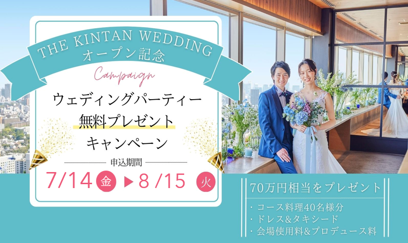 リニューアルを記念して、キャンペーン特設サイトから内覧のご予約をいただいた1組様にウェディングパーティーを無料プレゼントいたします。また、ダブルチャンスとして、抽選で5組様にKINTANお食事券10万円をプレゼントします。 ※キャンペーン特設サイト:https://kintanwedding.hp.peraichi.com/