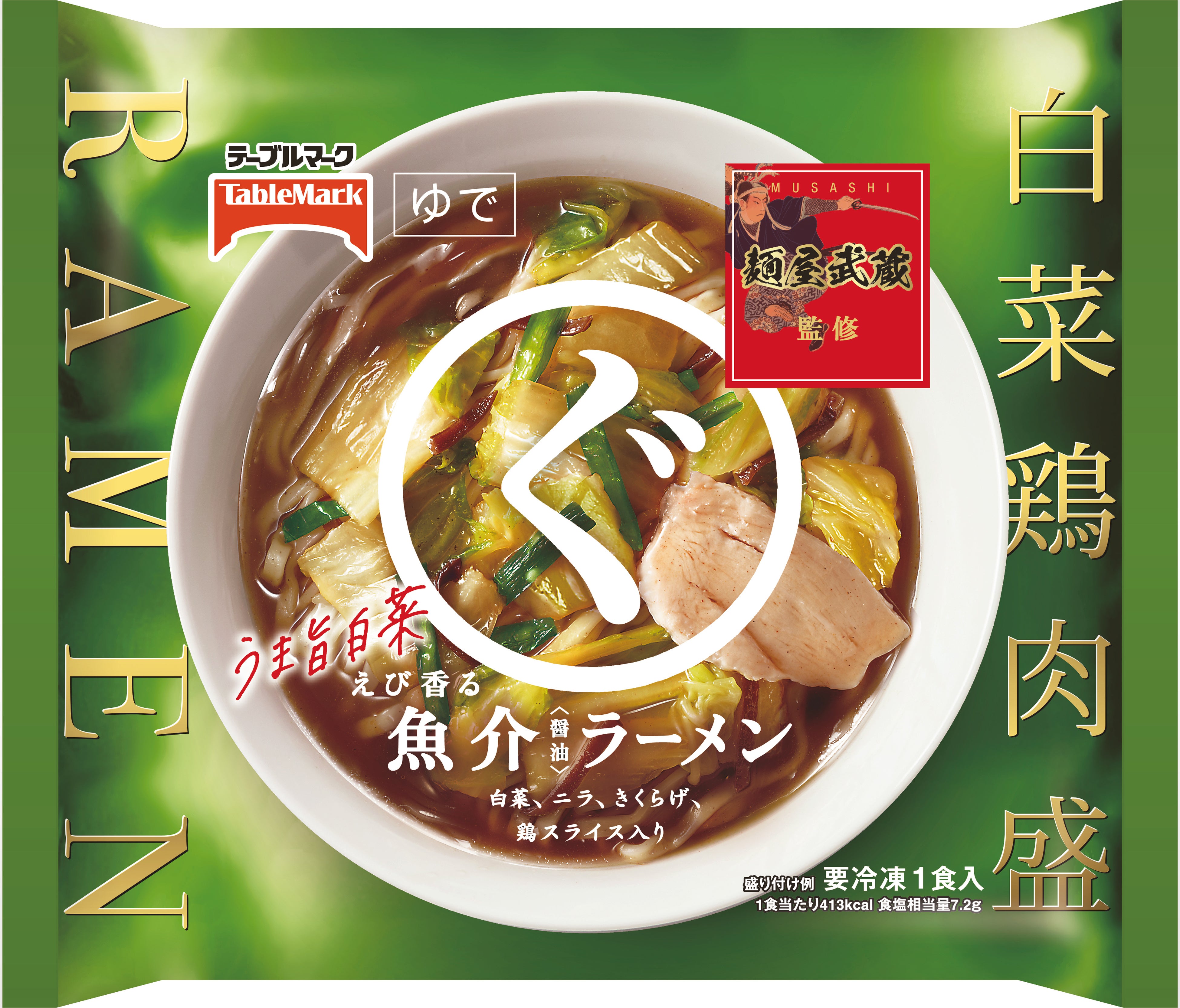 名店「麺屋武蔵」監修のこだわりの具材(白菜、ニラ、きくらげ、鶏スライス)をトッピングしております。