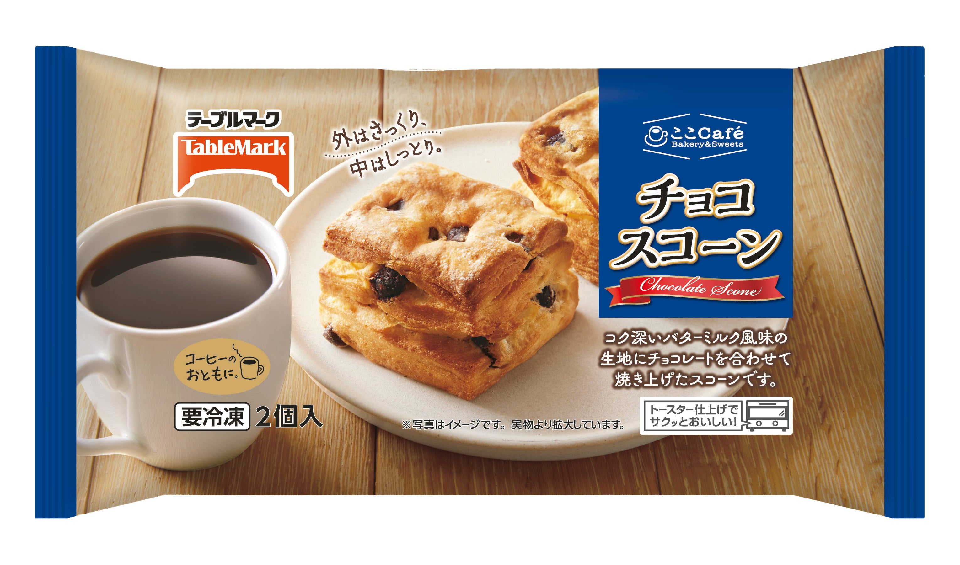 丁寧に折り込んだこだわりの生地にダイス状のチョコを合わせ、外はさっくり、中はしっとりとした食感に焼きあげました。チョコの味わいとバターミルクのコクがコーヒーにピッタリの味わいです。