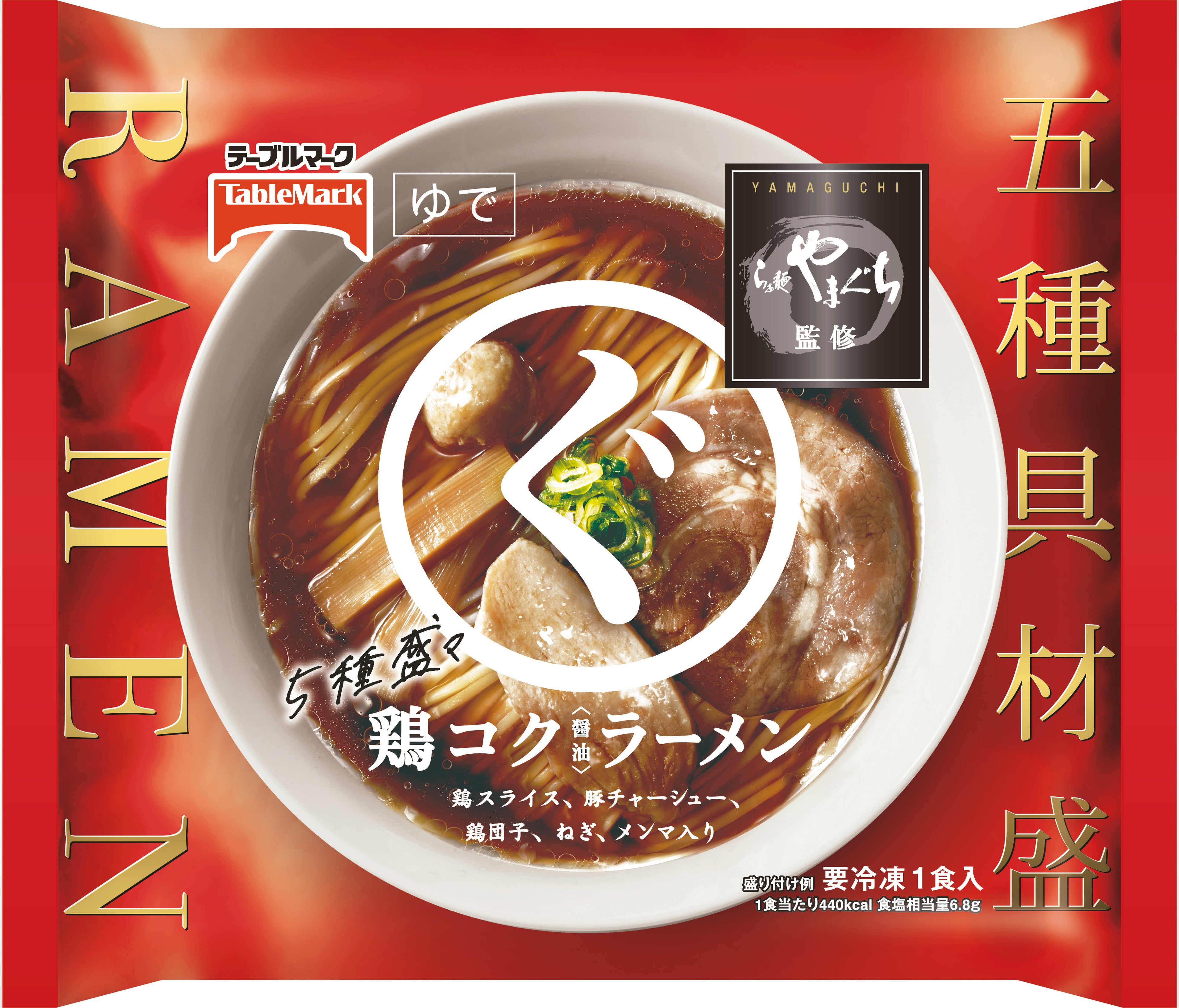 名店「らぁ麺やまぐち」監修のこだわりの5種類の具材(鶏スライス、豚チャーシュー、鶏団子、ねぎ、メンマ)をトッピングしております。鶏ガラの香り引き立つ味わい深い醤油ベースのスープとご一緒にお楽しみください。