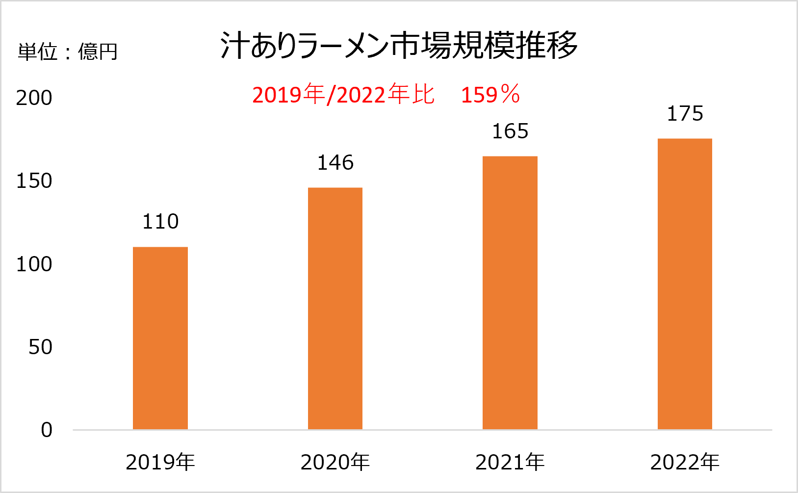 冷凍具付(汁あり)ラーメン市場は、コロナ禍の影響によるご家庭での冷凍食品の喫食機会の増加や、新商品の投入が続いていることを背景に2019年から2022年までに約159%の伸長を見せています。