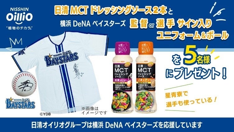 この度、選手も使用する日清MCTドレッシングソースと監督または選手のサイン入りユニフォーム、ボールのセットが当たるTwitterキャンペーンを実施します。日清オイリオ公式Twitterアカウントをフォローし、該当のツイートをリツイートしてくれた方の中から、抽選で5名の方にプレゼントします。