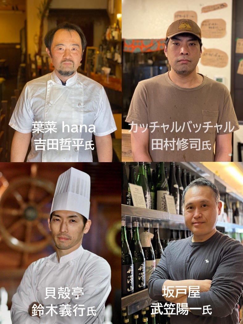 仏蘭西料理店 貝殻亭 (勝田台)の鈴木義行氏 、 葉菜 hana(勝田台)の吉田哲平氏、カッチャルバッチャル(大塚) の田村修司氏による実演形式のオリジナルビュッフェを40名限定で提供。お酒は100年以上続く老舗酒屋坂戸屋(溝の口)の店主 武笠陽一氏が日本酒を中心にお料理にあったお酒をセレクトします。地元から愛され続けて40年の老舗本格フレンチレストランの貝殻亭の鈴木氏、地元の有機農家とタッグを組み、身体にやさしいご飯作りをワークライフとしている吉田氏、ごちゃ混ぜを意味し連日満席の店を持つ田村氏の3名によるスパイスとフレンチの組み合わせは要注目です。また武笠氏の選ぶ日本酒とスパイスの効いたお料理とのペアリングにも乞うご期待です。