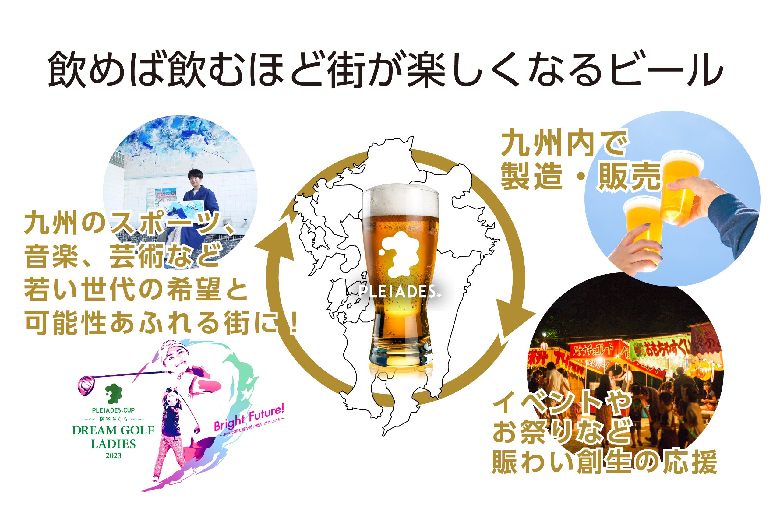 福岡・九州のスポーツ・アート・音楽・ダンスなどのスポンサードや大会の開催を通じ、その収益の一部が地域に還元される、「飲めば飲むほど人も街も幸せになる」ことをコンセプトにした、これまでにない新しい形でお届けする九州発のビールです。