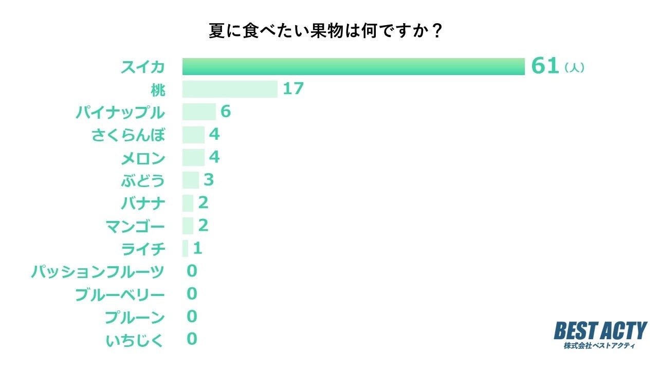 夏に食べたい果物について100人にアンケートを行ったところ、「スイカ」と回答する人が最も多い結果となりました。