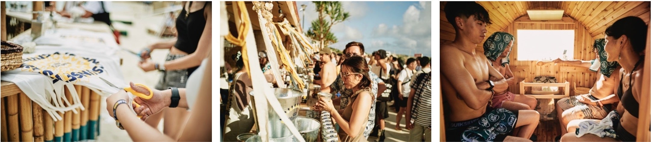 「CORONA SUNSETS FESTIVAL 2023」はライブパフォーマンスの他にも、会場内で体験できるワークショップも充実。オリジナルTシャツのリメイクや、今年新たに加わったコブマスターとサコッシュクージーの「パラコードワークショップ」など、ここでしか作れないオリジナルグッズのワークショップを楽しみました。さらに2019年に大人気だった“TTNE”アウトドアサウナが、さらにパワーアップして登場!フィンランド発、世界No.1サウナブランド「Harvia」のバレルサウナとオリジナルテントサウナは開場早々に予約枠が完売するほど人気を博し、真夏のビーチで「ととのう」贅沢なひとときを提供しました。