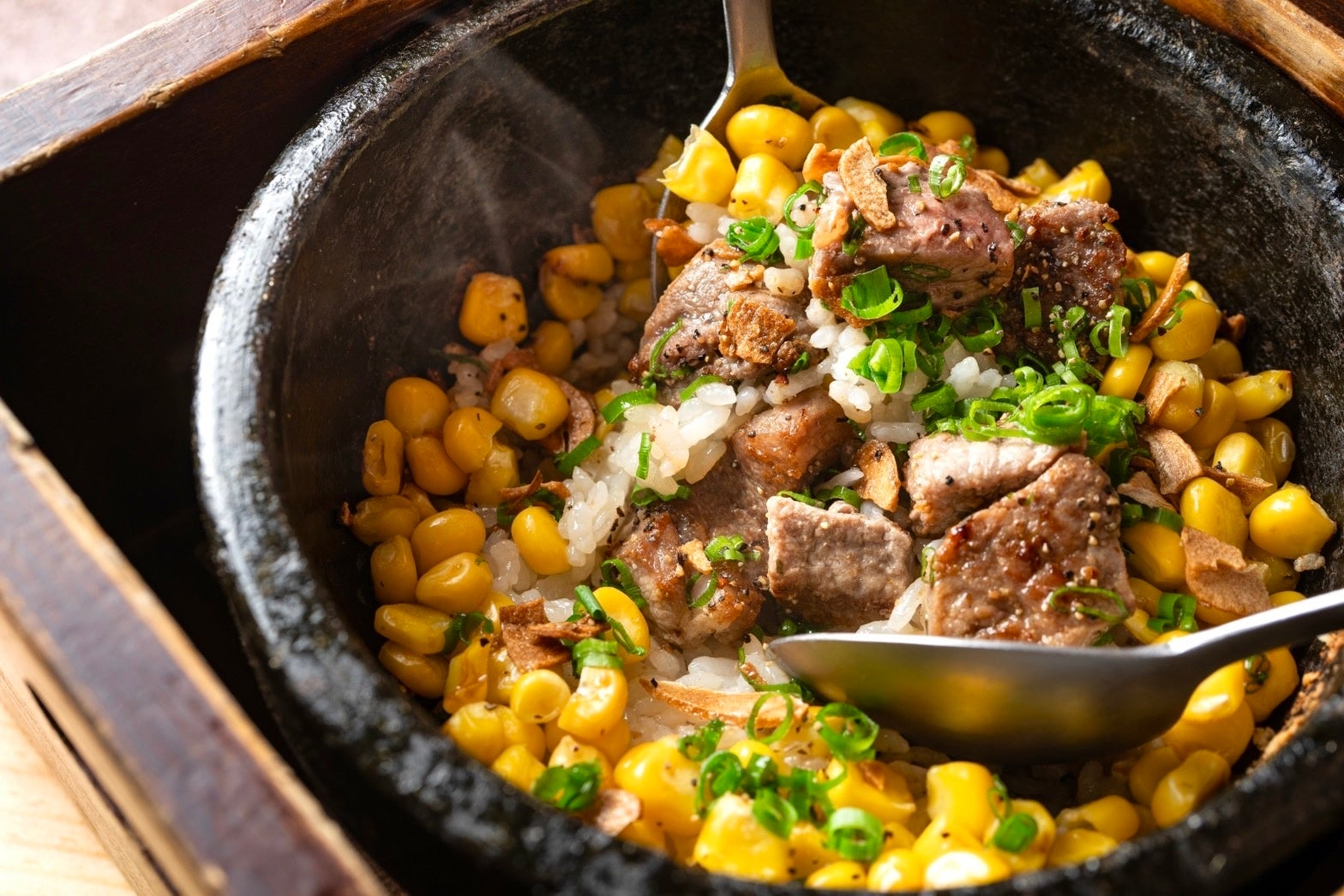 この十勝若牛のロースのサイコロステーキをコーンたっぷりのガーリックチャーハンにし、石焼丼で提供します。
