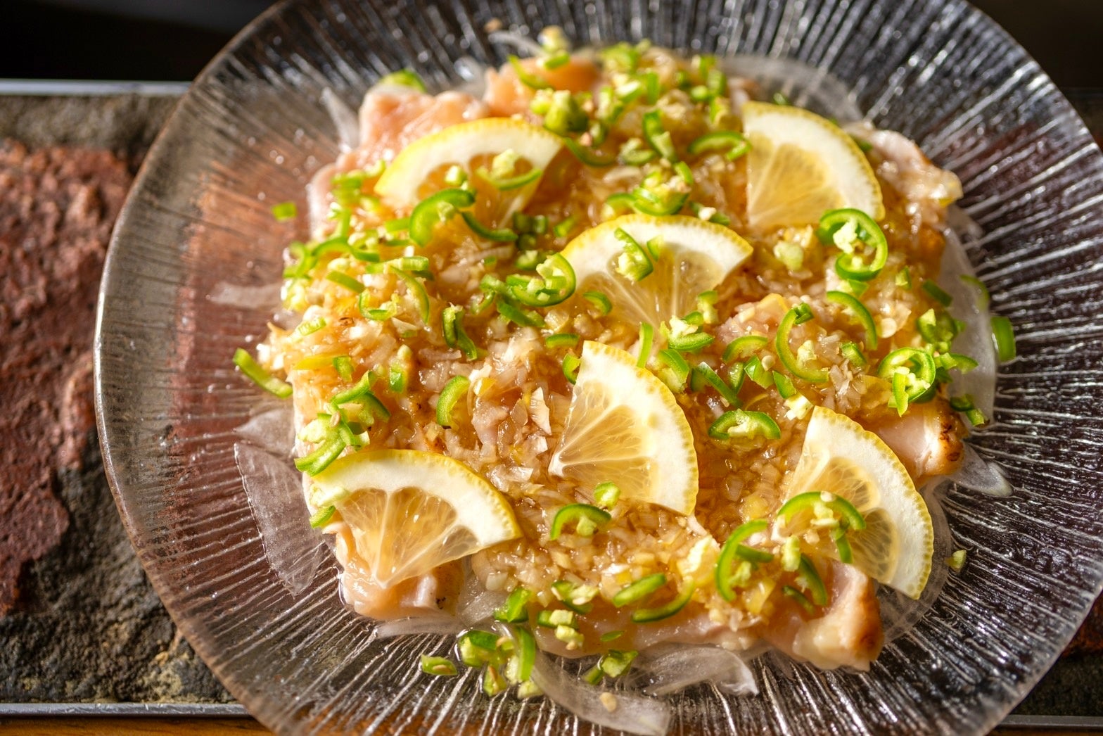 鮮烈な辛さの青唐とショウガ、レモン、ねぎ塩だれとオニオンスライスでさっぱりと。新得地鶏は旨味が強く、この強めの組み合わせでもしっかりと、肉のおいしさを楽しんでいただけます。