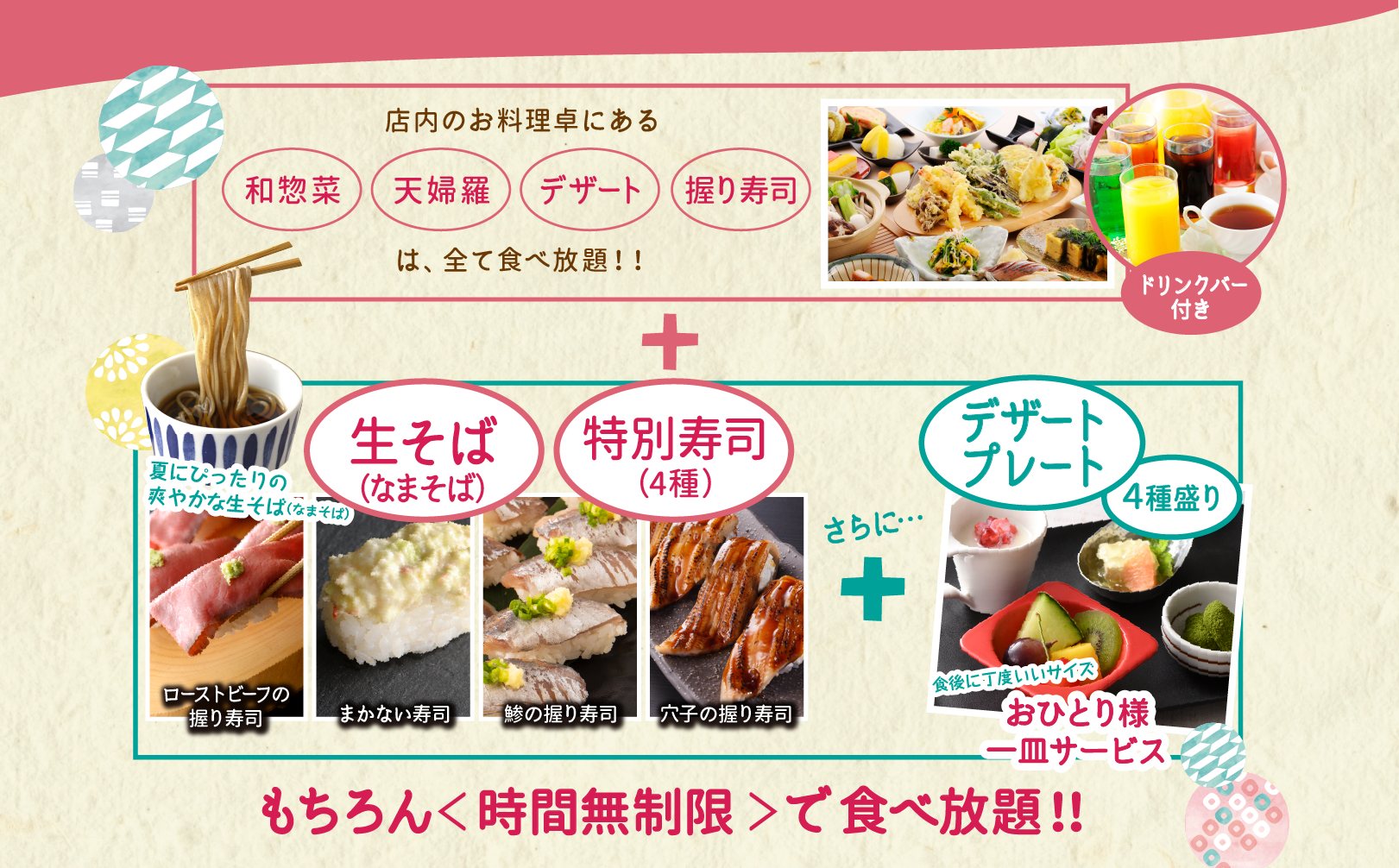 ・ブッフェ料理+ドリンクバー+生(なま)そば+特別寿司(4種)+デザートプレート(4種盛り)
