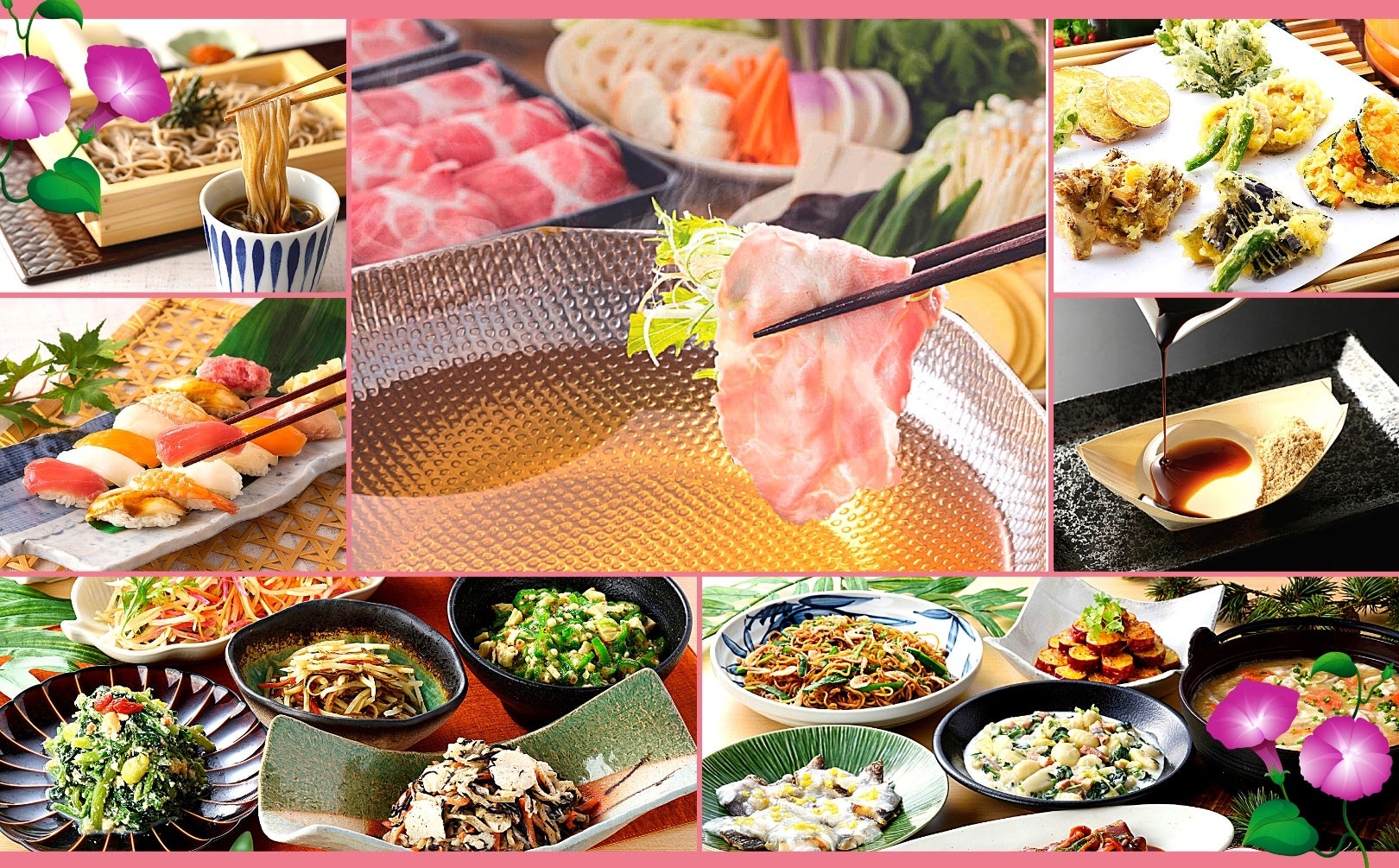 和惣菜を中心としたブッフェ料理、しゃぶしゃぶのほかに、人気のネタを取り揃えた握り寿司や揚げたてサクサク自慢の天ぷら、創業100年京都老舗店の厳選素材 削り節を使用した香りとコクが際立つ本格そばつゆとともにいただく、のど越しの良い生(なま)そばなど、世代を超えて楽しめる和のごちそうが勢ぞろい!