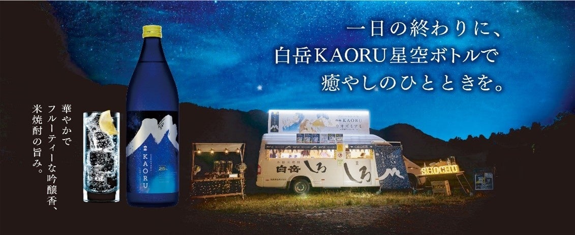 定番メニューとして、レモンの酸味が「白岳KAORU」の吟醸香を引き立てる「KAORU星空レモンサワー【辛口】/【甘口】」、白岳KAORU独特の果実のような吟醸香とソーダの相性が抜群な「KAOR星空ハイボール」、白岳KAORUの吟醸香をさらに華やかにする「KAORU星空ジャスミン」、爽やかさで飲みやすい一杯にした「KAORU星空グリーンティ」をご提供します。